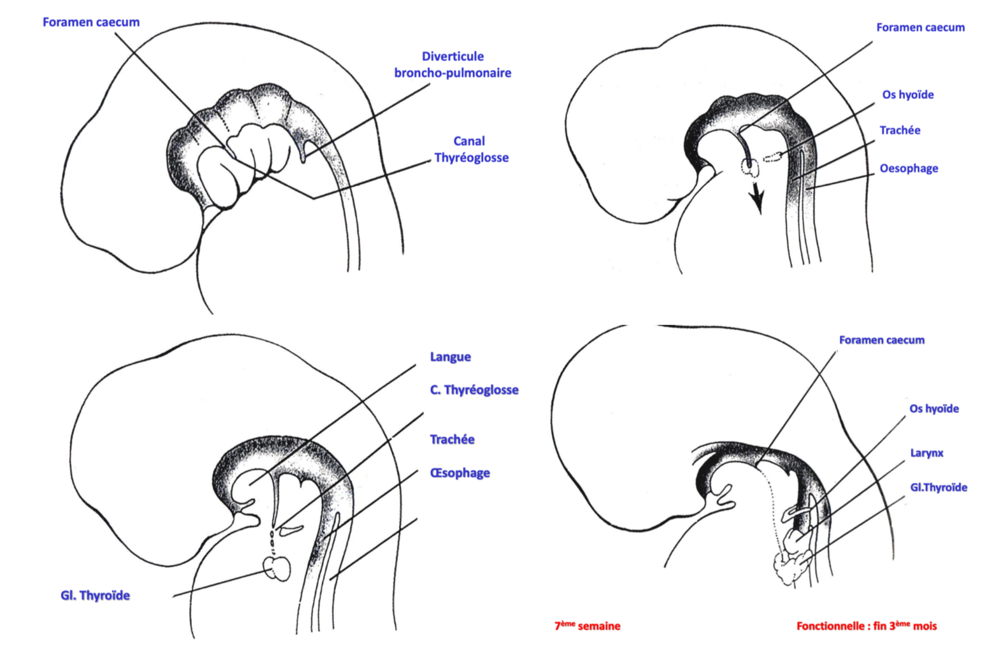 Tuteur Solution Batman_sans_Robin Posted March 3 Tuteur Solution Posted March 3 (edited) Salut @Rhomolium ! Ici on essaie de te piéger entre glande thyroïde et parathyroïde Normalement il y a 8 poches, 4 ectoblastiques et 4 entoblastiques. Dans les poches entoblastiques : - 3e poche supérieure donne la glande parathyroïde inférieure - 3e poche inférieure donne le thymus - 4e poche supérieure la glande parathyroïde supérieure La thyroïde vient du foramen caecum. Il va s'invaginer pour former le canal thyréoglosse. Lui va proliférer et s'allonger caudalement pour donner finalement la thyroide. Puis le canal est censé disparaître. J'ai répondu à ta question ? Edited March 3 by Batman_sans_Robin Rhomolium, Samlarousse and framboise 2 1 Quote