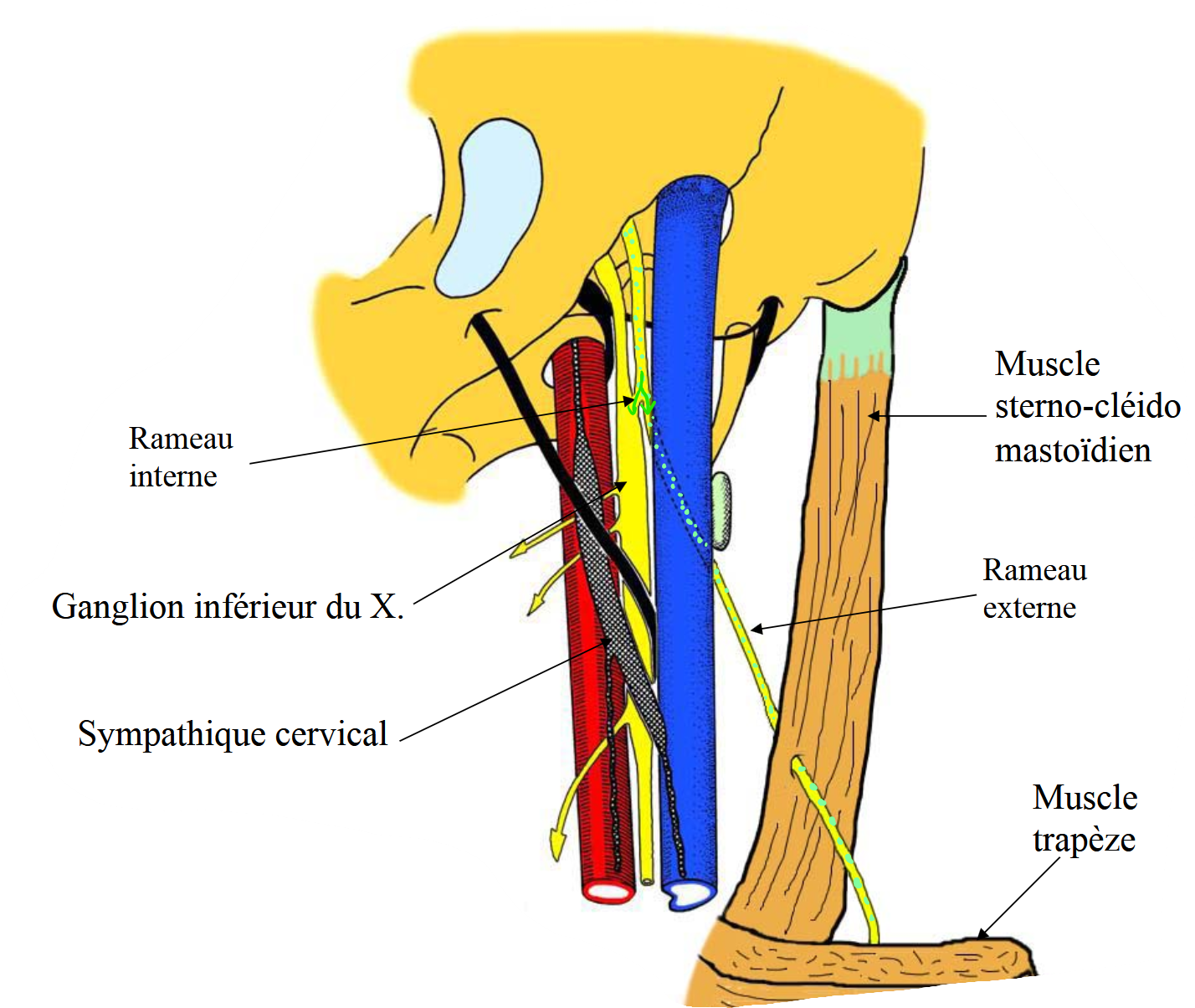 Solution ratasse Posted March 6 Solution Posted March 6 Salut ! Voilà un petit recap des trajets des nerfs crâniens dans la région cervicale. Je comprend totalement que tu aies du mal cette partie du cours est vraiment monstrueuse je trouve ça courageux que tu ne fasses pas l'impasse mdrrr :*) Jte conseille regarder les schémas que je t'ai mis pendant que tu lis mes descriptions ! NERF VAGUE (X) : Origine cervicale : il émerge du crâne par le foramen jugulaire. Trajet : il chemine entre l’artère carotide interne et la veine jugulaire interne dans l'espace rétrostylien. Sur le schéma on voit bien que le nerf vague passe en arrière de la carotide interne et en avant de la veine jugulaire interne ! (en jaune pointillés rouges) --> Le n. vague (X) passe en arrière du n. glossopharyngien (IX) --> trajet vertical dans le dièdre postérieur jugulo-carotidien (= triangle entre la veine jugulaire interne en DH et l'artère carotide interne en DD dans la gaine vasculaire commune entourant les éléments). Ensuite il traverse l'orifice supérieur du thorax dans cette configuration. Particularité : On retrouve 2 ganglions sur le X : - Le ganglion supérieur du X (intracrânien) - Le ganglion inférieur du X (dans l'espace rétrostylien dont on reparlera juste après avec le n. accessoire !) NERF ACCESSOIRE (XI) : Trajet : Trajet court en ventral de la veine jugulaire interne (espace rétrostylien); Puis il se divise en 2 pour donner 2 rameaux : - Le rameau interne avec un trajet court pour rejoindre fameux ganglion inférieur du X. - Le rameau externe avec un trajet long. Il croise en ventral la veine jugulaire interne --> traverse le muscle SCM (qu’il innerve) --> gagne la région cervicale latérale --> atteint le muscle trapèze (qu’il innerve). (en pointillés verts sur le schéma qui est en vue dorsale) Fonctions : - Rameau interne : rôle dans la motricité laryngé --> déglutition (innervation motrice) - Rameau externe : Tourner la tête et lever les épaules (innervation motrice) NERF HYPOGLOSSE (XII) : Origine cervicale : le XII émerge (seul) du foramen hypoglosse. Trajet : Il décrit un trajet long et OBLIQUE en dorsal de la carotide interne. C'est donc l'élément nerveux le plus dorsal. Puis il descend vers la loge bicarotidienne pour ensuite remonter vers la langue qu'il va innerver. Donc au final il adopte un trajet concave vers le haut/en crânial. (on le voit bien sur le 2ème schéma en pointillés bleus) Puis dernières informations que tu comprendras mieux avec le 3ième schéma : --> Le XII se glisse dans l’espace entre le muscle hyoglosse et le muscle mylo-hyoïdien (on dirait pas mais croyons Bonnecaze mdr) --> Il est satellite de l'artère linguale. --> Il sur-croise les artères carotides interne et externe. Fonctions : nerf moteur de la langue (presque uniquement) Voilà j'espère que ça t'a aidé ! N'hésite pas si t'as d'autres questions ! Bon courage !!!! m_arina, Gaétang, marionisation and 7 others 2 4 3 1 Quote