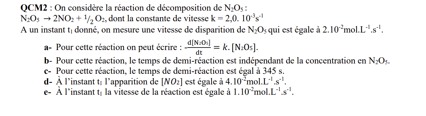 Responsable Matière Aaronigashima Posted March 9 Responsable Matière Posted March 9 54 minutes ago, TITTA said: je ne comprends pas pourquoi la d est fausse Salut, perso je suis pas d'accord avec la correction, on a bien la vitesse d'apparition du NO2 qui vaut 2 fois la vitesse de disparition du N2O5 selon l'equation bilan de reaction. Il doit surement s'agir la d'un errata, la team pharma UE11 pourra te le confirmer normalement. Bonne soirée ! Bastitine 1 Quote