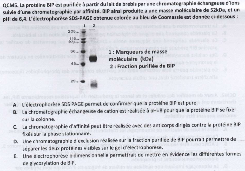 Responsable Matière Nentiqu Posted March 10 Responsable Matière Posted March 10 il y a 3 minutes, PauliNébuline a dit : Salut! Pourquoi l'item E est-il vrai? Merci! Coucou, je suppose déjà que l'électrophorèse peut être utile d'abord pour la séparation par poids moléculaire car la glycosylation influence le poids de la protéine, mais aussi car la deuxième dimension, en fonction du PH semble pertinente vu qu'on nous donne le PHi de BIP dans l'énoncé. En bref, je me verrai pas affirmer l'item à 100% avec les données qu'on a, mais je me verrai encore moins le mettre faux. Bon courage! Loïstamine 1 Quote