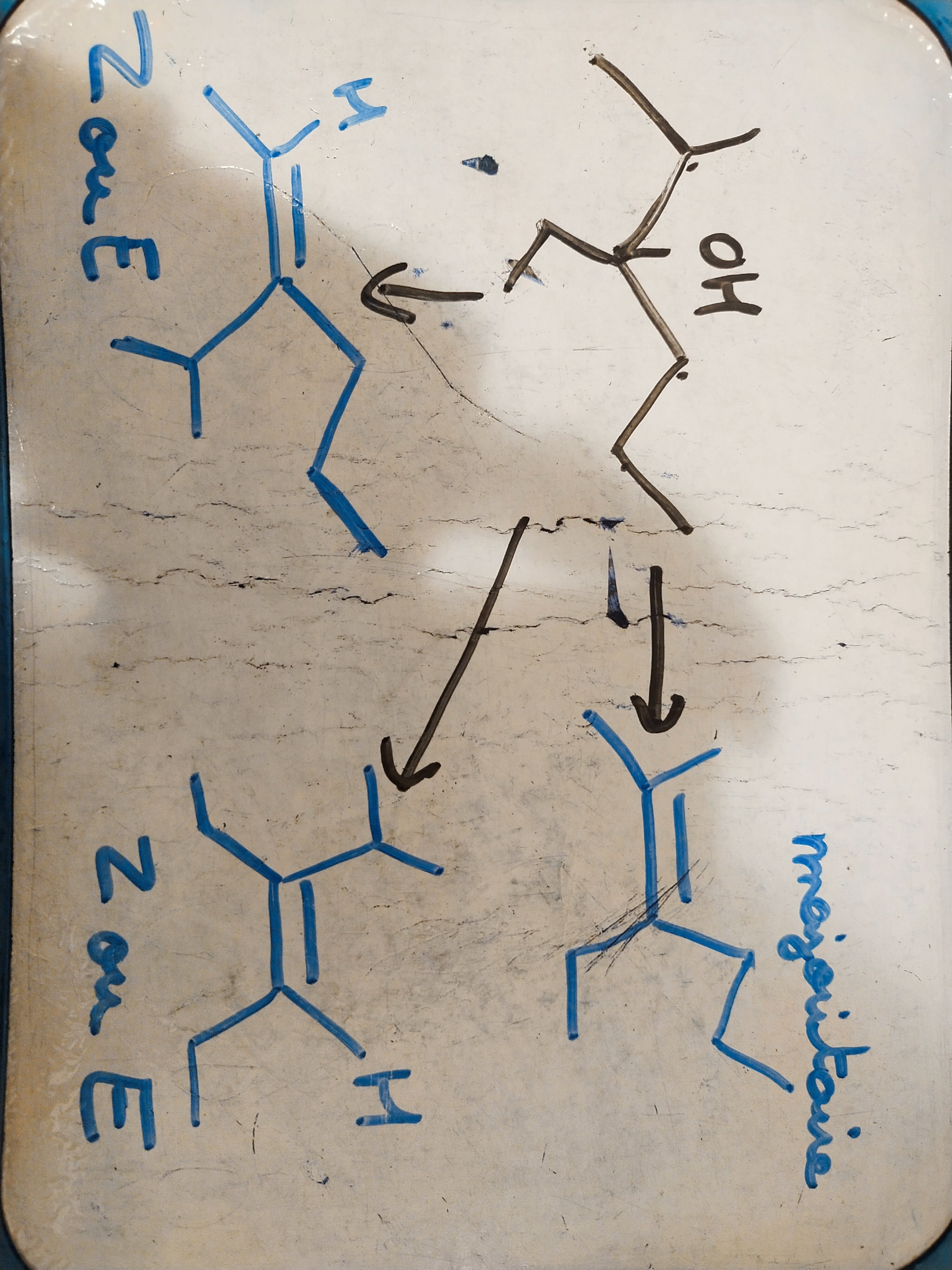 Pkahhhh Posted March 10 Posted March 10 Salutt Concernant la réaction de déshydratation du 3-éthyl-2-méthylhexan-3-ol sous H₂SO₄ à 170°C. J’ai bien compris que l’élimination suit la règle de Zaïtsev, ce qui favorise la formation de l’alcène le plus substitué, et que l’isomère E est généralement majoritaire à cause des contraintes stériques. Néanmoins, je crois m'être trompé dans la représentation de ces représentations et j'ai du mal à mettre la règle de Zaïtsev dans ce cas précis en oeuvre. Serait-il possible d’avoir la structure du produit majoritaire et minoritaire développé au lieu de la représentation topologique ? Je pense que cela m’aiderait à bien visualiser Merci beaucoup pour votre aide Quote
