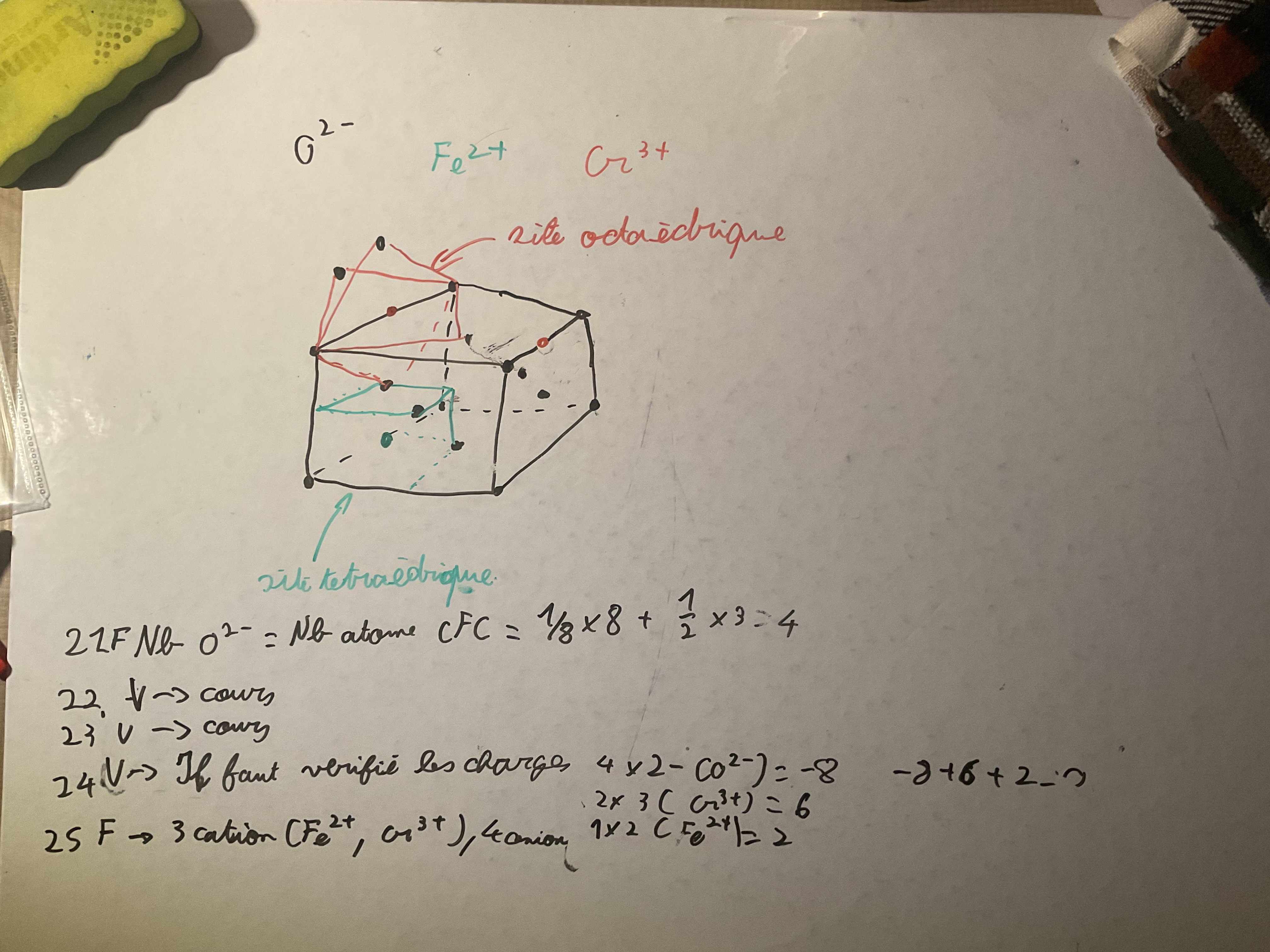 Tuteur Batman_sans_Robin Posted March 10 Tuteur Posted March 10 il y a 2 minutes, An-Schwann a dit : Il y a un problem si Google dis que c’est FeCr2O3, les chargé seront pas équilibré Non c'est 4, c'est moi qui sait pas écrire il y a 1 minute, Ellstar a dit : combien ya de sites octaedrique ? j'en compte 13 mais du coup comme on fais la moitié ? 1 central + 12 latéraux. Sauf que les latéraux se partagent en 4 maille donc 12/4 = 3 +1 -> 4 sites octaédriques. C'est clair ? An-Schwann 1 Quote