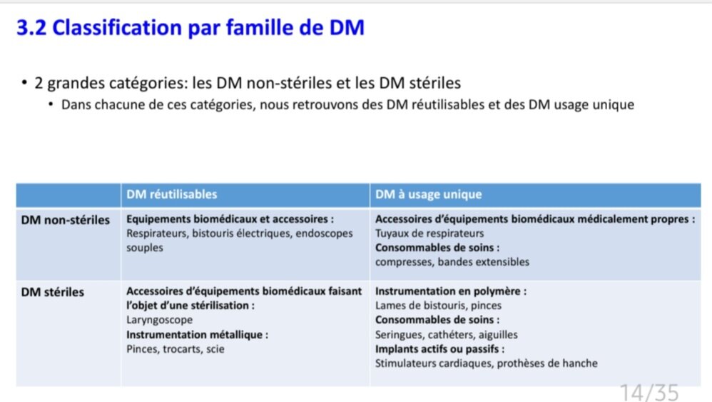 Solution Boulette Posted March 12 Solution Posted March 12 Coucou ! Il existe deux méthodes de classification des DM ! La première, la classification suivant le risque, classifie les DM en fonction des 5 critères que tu as évoqué, et donne les classes I IIa IIb et III. Cette classification ne prend pas officiellement en compte la stérilité. Mais il existe une autre méthode, la classification par famille ! Tu retrouveras le tableau page 14 du diapo du prof. Cette deuxième classification classe en fonction de la stérilité, et du caractère réutilisable ou non du DM ! C'est pour ça que l'item que tu as vu est compté vrai ! Bonne journée et bonnes révisions ! Pala.off, Quentingersois and An-Schwann 2 1 Quote