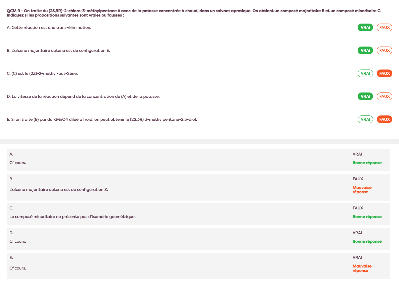 Responsable Matière ju.gulaire Posted March 12 Responsable Matière Posted March 12 Coucouuuu l'alcène majoritaire n'est pas tjrs le E, il faut suivre la règle de Zaitsev → mais en gros vu que tu fais une trans-élimination, en partant de SR et RS tu obtiens l'alcène Z en majorité ! (si tu partais de RR/SS tu aurais le E en majorité) J'espère que ça t'aidera, les tuteurs n'hésitez pas à me corriger ! Nentiqu 1 Quote