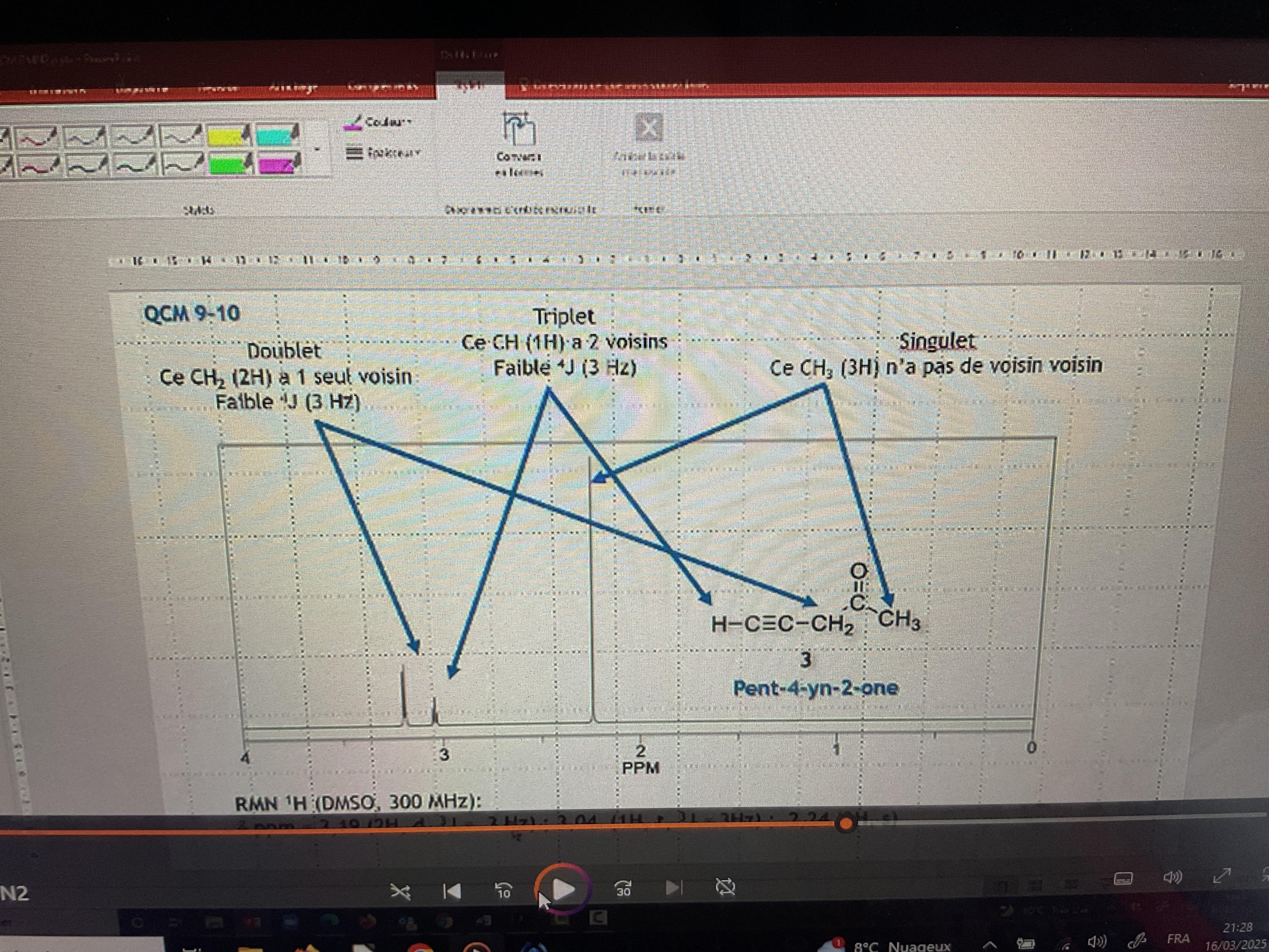 Passensible Posted March 16 Posted March 16 Bonsoir, Je n’arrive pas à comprendre la manière dont le prof décompose les doublets, triplets,… des portons des molécules. Par ex, pr cette molécule, j’avais fait cela: Je sais maintenant que j’ai fais erreur ici car je dois faire correspondre doublet, triplet,… SEULEMENT quand on a des H. alors que dans sa correction il fait PAS DU TOUT ca: je comprends pas pq pr le H du CH, il dit que le CH a 2 voisins?????, je comptais par rapport aux atomes liés au carbone qui porte cet H, par ex pr dernier CH3, j’avais mis que c’était un un singlet car il n’a pas de voisin (le carbone lié au carbone qui le porte ne porte aucun H), le CH2 pr moi n’a aussi 0 voisin donc c’était un doublet… Merci bcp de vos clarifications! Quote