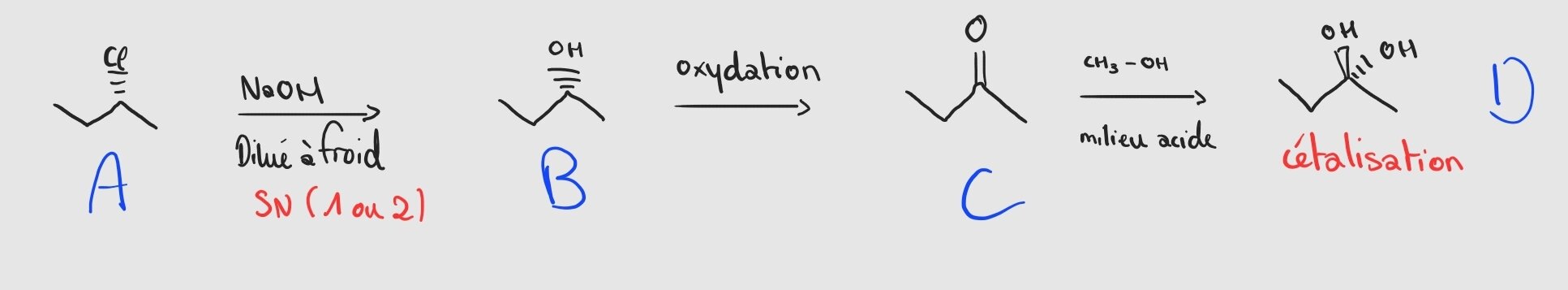 Pkahhhh Posted March 17 Posted March 17 Coucou, Est-ce que quelqu'un pourrait me dessiner les molécules qu'on obtient svp, ça m'aiderait bcp: Le (2R)-2-chlorobutane (A) est traité par de la soude diluée en solution aqueuse à froid pour conduire au composé B. L'oxydation du composé B conduit au composé C. Ce dernier subit l'action de l'éthanol en excès en milieu acide pour donner le composé D et de l'eau Merci d'avance Bonne journée Quote