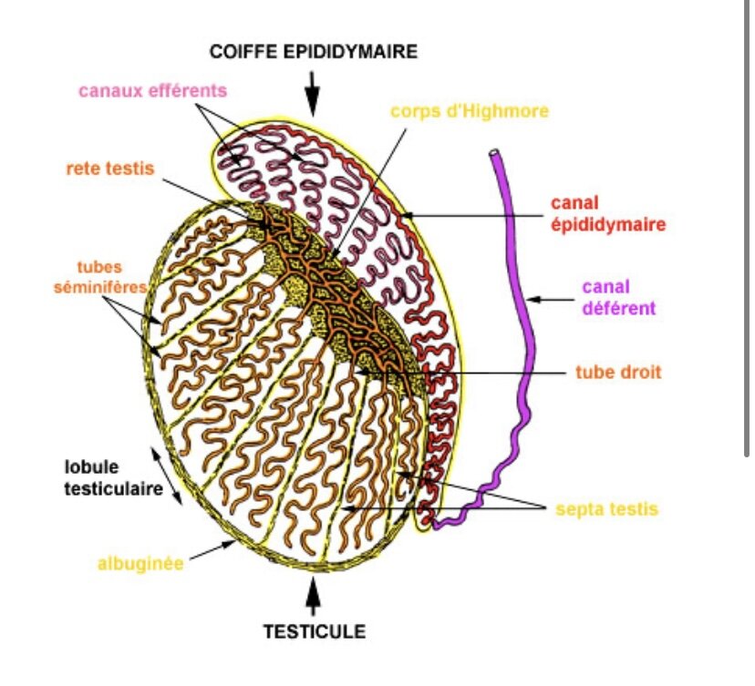 Solution Kz.22 Posted March 17 Solution Posted March 17 Salut! il y’a déjà un post qui traitait de cette question et au final pas vrmtn de réponse claire.. mais du coup déjà on va reprendre ces différentes partie du testicules (que tu as dû voir dans ton chap sur la spermatogenèse) Le rete testis C’ est une structure située dans le testicule qui reçoit les spermatozoïdes produits par les tubes séminifères Il agit comme un carrefour pour les spermatozoïdes avant qu'ils ne passent dans les canaux efférents Les canalicules efférents sont des canaux qui relient le rete testis à l'épididyme Ces canaux permettent aux spermatozoïdes de quitter le testicule et de se diriger vers l'épididyme pour maturation je te mets un schéma + celui du cours spermatogenèse : —->canal efférent: les canalicules efférents se connectent ensuite pour former des canaux efférent qui mènent les spermatozoïdes vers l'épididyme, où ils subiront une maturation c’est une structure + grande qui résulte de leur fusion mais c pareil du coup en gros c’est la même chose mais canalicules c’est + un terme embryologique qu’on utilise plus tellement à l’âge adulte en soit pck ça s’est développé et maturé en canaux efférents Ensuite dès la 7eme semaine c’est là où on va avoir la différenciation testiculaire: ça fait suite à la mise en place de l’expression du gène SRY On aura du coup la formation du rete testis + a la S9 les cellules d’origine des tubules mesonephrotiques qui se différencient en canalicules efférents —-> puis ils entrent en contact donc je dirais aussi que c’est S9 c’est là que ça commence aussi attention comment S8 pourrait être 3 eme mois alors que ça fs 2 mois? à moins que tu te soit dit qu’on entamait le 3 eme mois en qlq sorte? Bref mdrrr tout façon ça on oublie! Ensuite pk il y a une confusion avec le 3 ème mois? le processus de maturation des structures se poursuit jusqu'au 3e mois justement et c’est là que le contact entre le rete testis et les canalicules efférents est stabilisé et la structure est pleinement fonctionnelle pour le transport des spermatozoïdes vers l'épididyme Ca montre bien que ca commence avant pck ça se termine là justement sauf QUE mdrr encore une fois les cours de PASS peuvent pas prendre exactement la réalité puisque c’est trop compliqué surtout en embryologie et comme c’est des qcm avec des valeurs précises retiens ce que le prof veux s’il y a marqué 3 ème mois pour simplifier la chose pck c’est là que ça se fini vrmtn retiens ça j’espère que c’est + clair quand même.. aurisorius 1 Quote