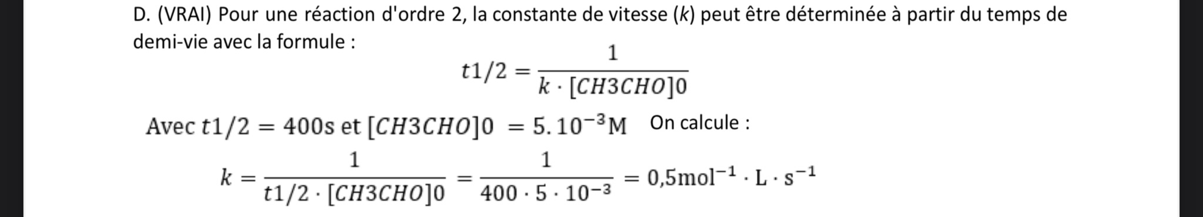 Tuteur ocyjocine Posted March 17 Tuteur Posted March 17 J'aurais une question concernant l'item D du QCM 20 de la session 2 (2023-2024). La formule de t1/2 pour une réaction d'ordre 1 n'est-elle pas t1/2=ln(2)/ak ? Car dans la correction, le coefficient stœchiométrique n'est pas pris en compte. Quote