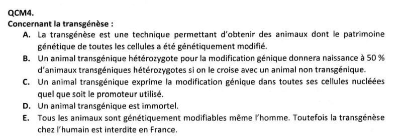 Solution MileyVirus Posted March 20 Solution Posted March 20 il y a 9 minutes, Catalyse a dit : Coucou, je comprends pas du tout pourquoi l'item B est vrai. Est ce que vous pouvez m'expliquer s'il vous plaît ? Pour moi c'était 25% et pas 50 Merci d'avance ! Bonne soirée coucou alors on va prendre les allèles M (modifié) et m (non-modifié), si tu croises ton animal transgénique (M/m) avec un autre animal transgénique (M/m) tu auras 25% homozygotes (M/M), 50% d'hétérozygotes (M/m) et 25% de non trans (m/m), si cependant tu croises un hétérozygote (M/m) avec un non trans (m/m), tu vas avoir 50% d'hétérozygotes (M/m) et 50% de non trans (m/m) tu confonds donc peut-être avec le croisement de deux hétérozygotes est-ce que c'est plus clair ? c'est compliqué d'expliquer sans tableau Ewangi-SprayMaldeGorge and Catalyse 2 Quote