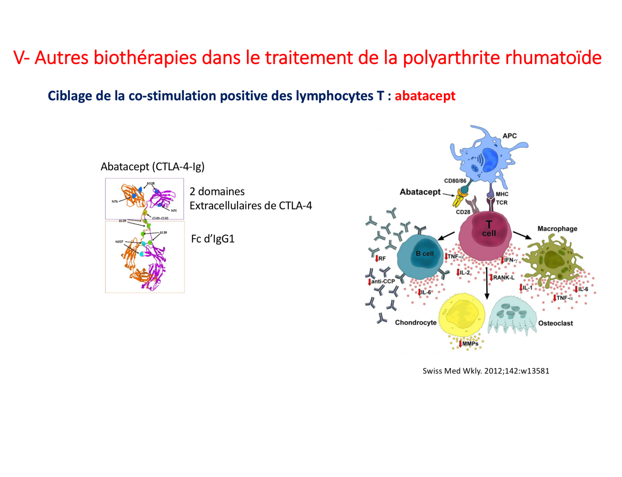 Solution jlr.10 Posted March 23 Solution Posted March 23 Salut @MileyVirus! Pour reprendre l’action du CTLA4-Ig (= abatacept) je te remet la diapo du cour : Comme tu peut le voir (et comme l’explique l’énoncé) le CTLA4-Ig est formé de la portion extracellulaire du récepteur CTLA4 donc cette partie va fixer les ligands de CTLA4 qui est le CD80/86 porté par la cellules dendritique (=cellule présentatrice de l’antigène). L’autre partie du CTLA4-Ig et le fragment Fc d’un anticorps dendritique type IgG1 (cellule qui permettrait selon moi la Phagocytose de la DC par les macrophage mais je n’en suit pas sûr). Donc enfaite le mécanisme est le suivant : Normalement le CD80/86 porté par la DC va interagir avec le CD28 porté par le LT —> ça correspond au signale de co-stimulation qui active le LT et permet sa prolifération, sa différenciation et donc son action (production de cytokine pro-inflamatoire, etc…) De manière aussi normale, après avoir reçu le signa de co-stimulation, le LT exprime très rapidement le CTLA4 qui lui va interagir avec le CD80/86 porté par la DC —> ça c’est un signal d’inhibition de l’activité du LT pour justement empêcher que la réaction inflammatoire devienne trop importante (si le prof n’a pas expliqué cela en cour ce n’est pas la peine de le retenir. Ce qu’il faut retenir c’est que CTLA4 est inhibiteur de l’activation des LT). Ainsi le CTLA4-Ig (abatacept) va venir se fixer sur le CD 80/86 porté par la DC pour empêcher qu’elle donne le signal de co-stimulation au LT. Ainsi on empêche l’activation du LT et donc on essaye d’empêcher la réaction inflammatoire. Donc l’item E est faux car le CTLA4-Ig n’interagit absolument pas sur le CTLA4 porté par le LT, mais il interagit sur le CD 80/86 porté par la DC pour bloqué la délivrance du signal de co-stimulation et donc empêcher l’activation du LT. J’espère que c’est plus claire. N’hésite pas si tu as d’autres questions ! Bon courage ! Fodiliaque and dzinthesky 1 1 Quote