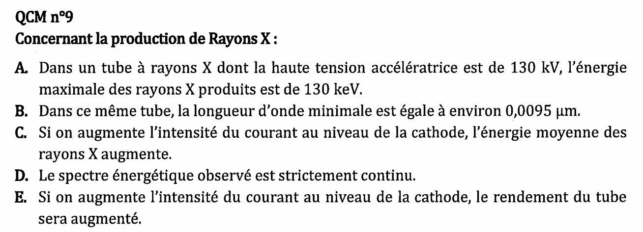 bibine Posted May 16 Posted May 16 Bonsoir SVP je ne comprends pas pourquoi l'item A est marqué vrai. Dans la correction, il est écrit lambda max = U max mais je ne comprends pas d'où ça vient. Et aussi, dans la formule de E max = e U , quelles sont les unités de chaque ? est-ce que Emax est en eV ou keV ? et U en V ou kV ? je demande parce que dans la formule lambda min = 1240 / Emax , ici le Emax est en keV... Quelqu'un pourrait m'aider svp ? Merci !!! Quote