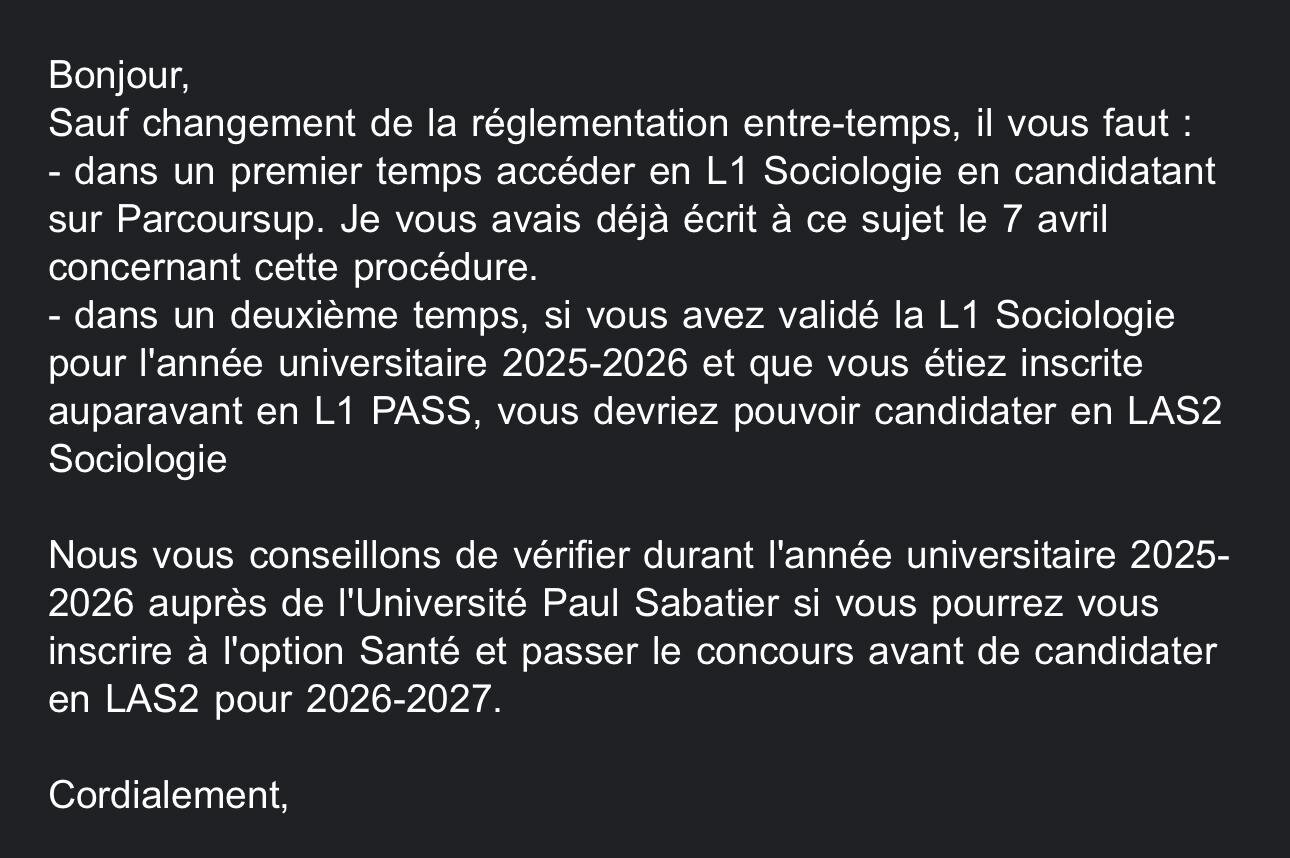 Ancien Responsable Matière POMME Posted May 20 Ancien Responsable Matière Posted May 20 Il y a 1 heure, Panabenz a dit : Hellooo déjà merci bien pour ta réponse :) euh enft oui je m’inquiète plutôt par rapport au fait d’avoir fait une L1 socio pour rien… genre je me dis imagine ils se disent allez ça y est on va enlevé toutes les LAS littéraires et sciences humaines et on va laisser que les licences scientifiques :)) d’un autre côté je me dis s’il y a toujours une option pass mineure socio pour la rentrée prochaine du coup càd que forcément il y aurait des LAS2 socio aussi (ça me parait logique) De toute façon on ne sait même pas si il vont laisser le système de LAS, de ce que j’ai lu si réforme il y a le but c’est de faire une voie d’accès unique mais en conservant les diversité de parcours donc pas forcément conserver l’accès depuis les licences. Je suis d’accord que c’est chiant de faire une L1 pour rien mais pas dit que la réforme tombe l’année prochaine. Ce que je te conseille c’est de choisir une L1 qui te plait (si tu as fais différentes demandes parcoursup) dans laquelle tu te voie continuer si jamais la LAS2 ne passe pas pour ne pas juste faire une licence dans le vents comme ça si jamais ils réforme tu pourras tenter ta chance l’année d’après et si jamais ça ne passe pas tu pourras toujours finir ta licence pour pas repartir de rien. Si il n’y a pas de réforme tu pourras candidater en LAS2 ou LAS3 et si ça passe pas valider ta licence et continuer tes études hors médecine. Il y aura forcément un accès depuis la LAS2 socio l’année pro mais si il vote une réforme l’année prochaine (2025-2026) il n’y aura peut-être plus de LAS2 l’année d’après (2026-2027). Après il n’y a pour l’instant rien d’annoncé ou de voté donc je serais toi je n’éviterai pas la socio juste pour ça. Le temps qu’ils trouvent un truc mieux, qu’ils finalisent leurs idée et qu’ils votent le truc et que ça passe pas sur que ça arrive l’année pro… Je te partage le liens du compte insta de la reprez, branche de la corpo de médicine qui est normalement vachement au courant sur les dernière réforme ou projet de réforme : https://www.instagram.com/la_reprez_toulousaine?utm_source=ig_web_button_share_sheet&igsh=ZDNlZDc0MzIxNw== Essaye de leur envoyer un message (soit au compte direct soit au de compte qui sont tag dans leur bio) il auront sûrement plus d’info sur une possible réforme. Voila je sais pas vraiment quoi te dire de plus si ce n’est bon courage. Panabenz 1 Quote