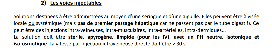 Tuteur Gojo Posted October 4 Tuteur Posted October 4 (edited) Bonjour, alors en regardant le diapo du prof que je te met ci-dessous, l’item E est bien vrai. En effet, les injections IV sont obligatoirement limpides, c’est à dire qu’elles ne contiennent pas de particules en suspension. Néanmoins, cela n’exclue pas le fait que d’autres voies injectables tel que l’IM soient limpides aussi, bien que non obligatoire. Pour le deuxième QCM la correction indique que la limpidité est obligatoire seulement en IV, mais on peut avoir d’autres voies injectables qui sont aussi limpides. En gros, la limpidité est obligatoire en IV, mais ne lui est pas spécifique. Si c’est pas clair, hésite pas! Edited October 4 by Gojo Quentingent, elsaccharose and PaulBasal 2 1 Quote