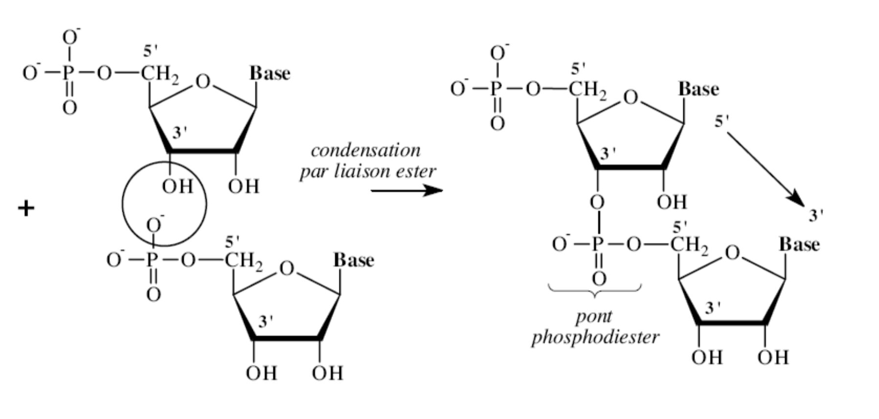 MahelpMeDoc Posted September 19 Posted September 19 (edited) Salut, Pour comprendre l'élongation de l'ADN de 5' en 3' il faut comprendre la numérotation des carbonne du ose ( ce qui explique le prime ' pour distinguer de la numérotation des bases azotées) : On sait que le phosphate du nucléotide est lié au sucre par une liasion esther en 5' Ensuite, avec notre nucléotide (nucléoside + phosphate lié en 5'), pour former une chaîne polynucléotidique : on va condenser le O- du phosphate et le OH lié au carbone 3' pour fomer une liaison phosphodiestercomme le montre ce shéma de la prof : Donc à la fin, avec les deux nucléotides liée, on voit bien que l'extrémité haute de la chaîne est au niveau du phosphate lié à un carbone 5' et que l'extrémité basse (et le lieu de la future liaison phosphodiester avec le prochain nucléotide) est au carbone 3' => c'est pour ça que la chaine est vectorisée de 5' en 3'. Parce que c'est le sens de formation de la chaîne. MAIS on a vu que la chaine phosphodiester se fait du carbone 3' du premier nucléotide vers le carbone 5' du second. Donc si on récapitule, > le sens d'élongation et de lecture de l'ADN se fait de 5' en 3' en prenant en compte les carbone le plus haut du premier nucléotide et du carbone du dernier nucléotide le plus bas = vision plus d'ensemble > la liaison phosphodiester se fait de 3' en 5' = vision sur l'enchaînement entre deux nucléotides consécutifs Je sais pas si c'est très juste scientifiquement mais c'est comme ça que je le retiens. Pour les nucléotides monophosphate et triphosphate. Le premier nucléotide qui va former le brin est un triphosphate, puis vient se rajouter un autre nucléotide triphosphate qui va former une liaison phosphodiester avec le précedent comme on a vu plus haut. Mais la formation de cette liaison a un important coût energétique qui va être permis par la libération des deux autres phosphates sous la forme de pyrophosphate. Ce qui explique pourquoi il y a un triphosphate en début de chaîne puis que des monophosphates parce que leur deux autres phosphate ont été libéré pour permettre la liaison. Voila j'espère avoir été assez clair, mais je reste qu'un PASS donc attend la réponse d'un tuteur plus calé que moi J'espère t'avoir aidé ! Edited September 19 by MahelpMeDoc Bastitine, Carence, An-Schwann and 2 others 2 1 2 Quote