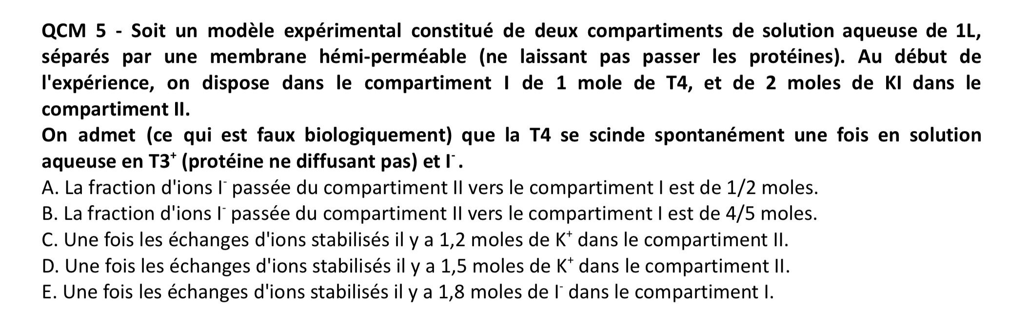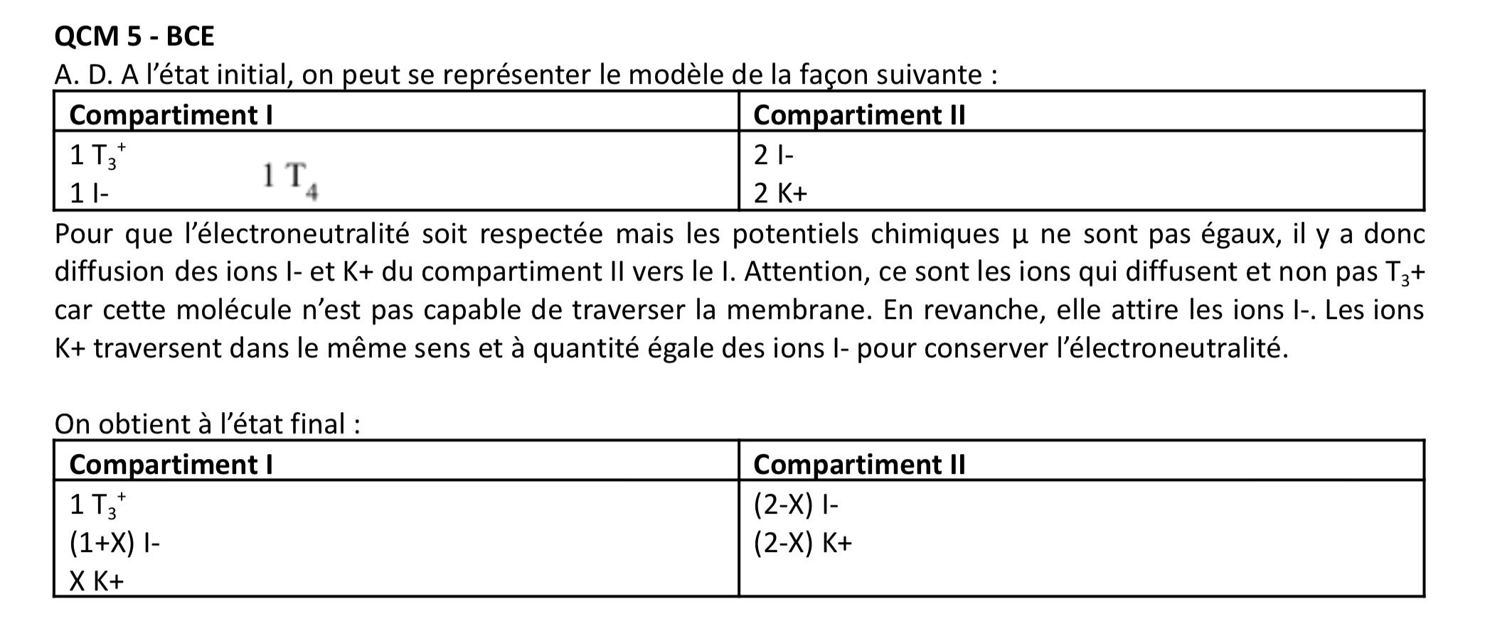 Responsable Matière Solution Cotytylédon Posted September 25 Responsable Matière Solution Posted September 25 Coucou ! Alors je vais essayer de t’expliquer au mieux : dans ce cas de figure, tu as une molécule, T3+, qui est trop grosse pour passer à travers ta membrane et qui va donc rester pendant toute la durée des échanges dans le compartiment 1 uniquement. Par contre, les ions I- et K+ vont eux diffuser afin de faire en sorte qu’on arrive à un équilibre entre le compartiment 1 et 2 au niveau des gradients de concentration et électrochimique. Ta protéine non diffusible a une valence positive, donc elle va plutôt attirer à elle des ions I- qui vont aller du compartiment 2 vers le 1. Mais, pour que l’électroneutralité soit conservée, ces ions vont aussi migrer en étant accompagné d’ions K+. Donc tu as un passage d’ions K+ et I- du compartiment 2 vers le 1. C’est pour cela que tu as des équations de type (1+…) à gauche, puisque c’est le compartiment receveur, et des équations de type (2-…) à droite car c’est le compartiment d’où partent les ions. Maintenant, pour déterminer le nombre de moles ayant traversé la membrane, il te faut savoir ton équation de Donnan et ensuite dérouler pour résoudre l’équation comme te le montre la correction. Je te la ré explique autrement : On a du côté des quantités de matière totales : (K1) + (K2) = 2 mol (I1) + (I2) = 3 mol et, pour respecter l’électroneutralité, il faut qu’à la fin des échanges tu aies de chaque côté : (K1) + (T3+) = (I1) et (K2) = (I2) Selon l’équation de Donnan, on a : (I1) x (K1) = (K2) x (I2) (I1) x (I1 - (T3+)) = (I2)2 (I1)2 - (I1)x(T3) = (I2)2 (I1)2 - (I1) = (3 - (I1))2 (I1)2 - (I1) = 9 - 6(I1) + (I1)2 5 (I1) = 9 (I1) = 9/5 =1,8 mol Et à partir de ça, tu peux répondre à tout le reste : on a (K1) + (T3+) = (I1) donc (K1) = 1.8 - 1 = 0.8 mol Donc (K2) = 2 - (K1) = 1.2 mol et voilà ! Hésite pas si tu as encore des questions ! HectoPascal, Bastitine, Lolordose and 1 other 1 2 1 Quote