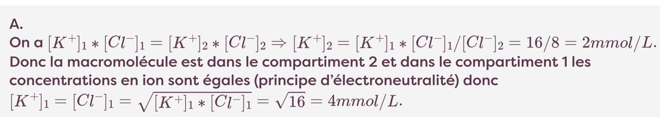 sarahdvt Posted September 27 Posted September 27 Bonsoir, c’est par rapport à la correction de ce QCM : Je n’arrive pas à comprendre pourquoi la macromolécule se trouve dans le compartiment n°1 après avoir appliqué le principe de neutralité. Merci beaucoup :) bon week-end QCM 1 - Un récipient est séparé en deux compartiments 1 et 2 par une membrane dialysante. Chaque compartiment contient une solution de KCl (chlorure de potassium). Dans l’un des compartiments se trouve aussi une macromolécule ionisée et non diffusible. On précise que la valence de la macromolécule est de 6 et que l’électrolyte associé à la macromolécule est un des ions déjà présents dans la solution. À l’équilibre, on a : et : A. La concentration en K+ dans le compartiment 1 est de 8 mmol/L. Quote