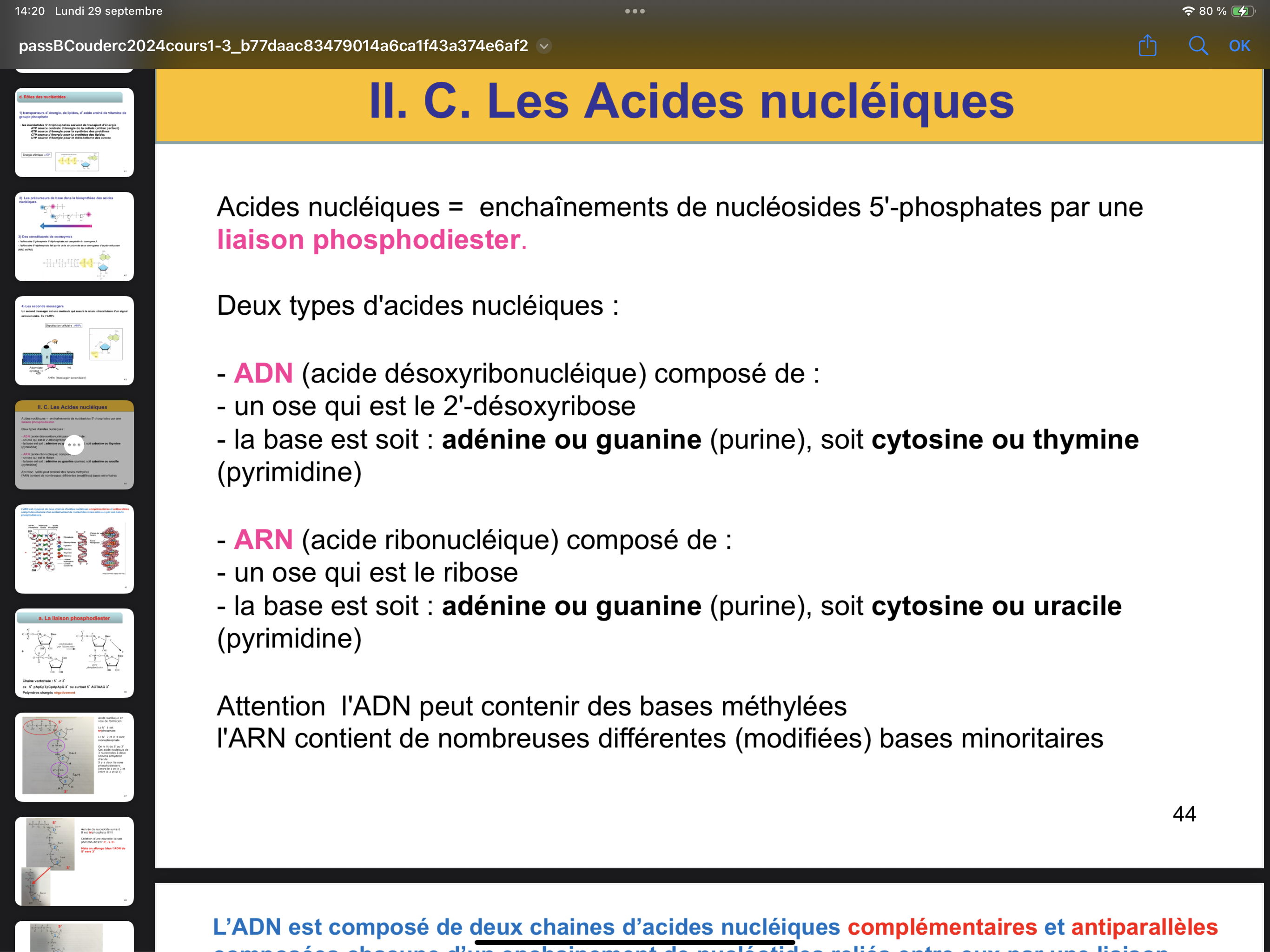 axel_rmdo Posted September 29 Posted September 29 Il y a 7 heures, emmie.vln a dit : Salut, pour moi l’uracile n’est présente que dans l’ARN. (Cf diapo ci-dessous) Peut être que tu confonds avec la thymine puisqu’il me semble que la professeure insiste sur le fait que la thymine est majoritairement dans l’ADN mais qu’elle peut se retrouver dans les ARNt par exemple. Après si tu es allée en cours et que tu es sûre que la professeure a dit que l’uracile se trouve essentiellement dans l’ARN alors retiens plutôt ce que la prof a dit. J’espère avoir pu aider ! Bonsoir, mais lors de la réplication les amorces sont faites d'ARN, que l’on peut donc retrouver dans l'ADN, mais du coup es ce que on peut quand même compter le "forcément" juste ? Quote