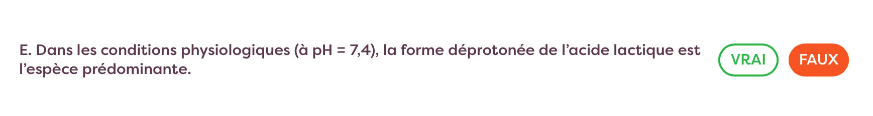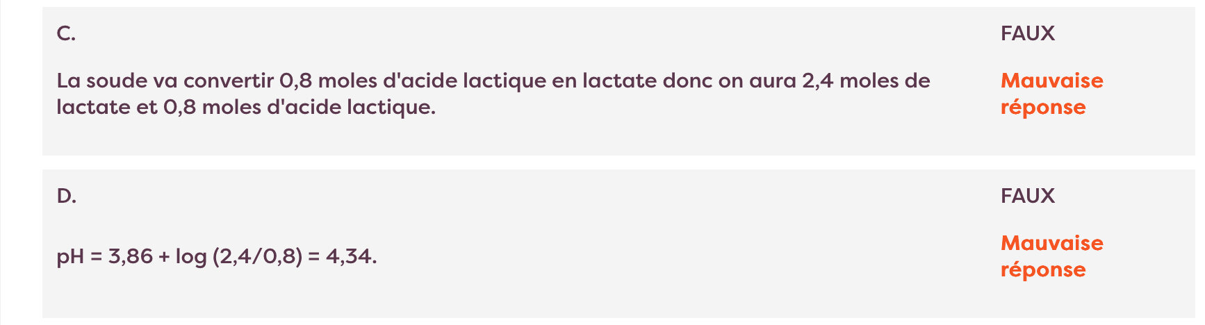 Tuteur Solution Jadénine Posted October 1 Tuteur Solution Posted October 1 Coucou ! En premier lieu, on te donne la constante de dissociation de l’acide lactique. Or, elle te permet de savoir que l’acide n’est pas totalement dissocié en solution ce qui en fait un acide faible. Pour l’item D, tu dois utiliser la formule : pH = pKa + log ([A-]/[AH]) avec pKa = - log(Ka) Donc pKa = - log (10-3,86) = 3,86 D’où pH = 3,86 + log (2,4/0,8) = 4,34. En sachant que 2,4 correspond à la quantité de base (quantité de lactate de sodium + quantité de soude) et que 0,8 correspond à la quantité d’acide lactique. Enfin, pour l’item C, comme tu as 0,8 moles de soude, elle va réagir avec 0,8 moles d’acide lactique qu’elle va transformer en lactate. Or, on en avait déjà 1,6 moles. Donc 1,6 + 0,8 = 2,4 moles. Parce qu’en fait, la soude est une base qui réagit avec l’acide lactique qu’elle va transformer en base : le lactate. N’hésites pas si tu n’as pas bien compris une de ces explications ! Pour l’item E, en fait, la forme déprotonée d’un acide correspond à sa base conjuguée. Or à pH, 7,4 : pKa < pH donc la forme basique est prédominante. Il te faut retenir que si : pH > pKa : forme basique pH < pKa : forme acide Cotytylédon, An-Schwann and Lolordose 1 1 1 Quote