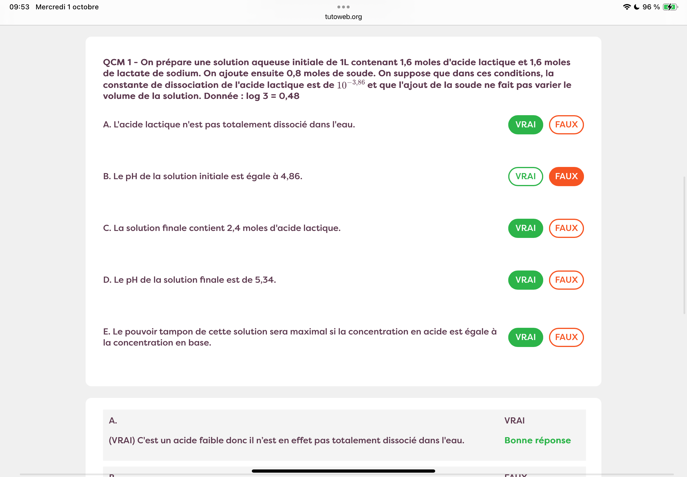 Margonosomale Posted October 1 Posted October 1 Bonjour ! Est ce que quelqu’un peut m’expliquer comment je suis sensée résoudre ces items. (B et C) et aussi comment je suis sensé savoir que l’acide lactique est un acide faible pour l’item A ?? MERCII Quote