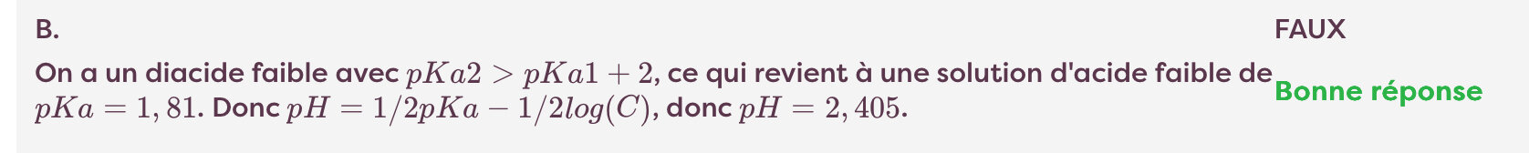 Tuteur Jadénine Posted October 1 Tuteur Posted October 1 Ici, on remarque le fait que l’acide sulfureux est un diacide (information donnée dans la diapo 7 du cours). De fait, on utilise une formule simplifiée dédiée aux diacides faibles : pH = 1/2 (pKa1 - logC). Il s’agit d’un cas particulier qu’on utilise rarement. Quote