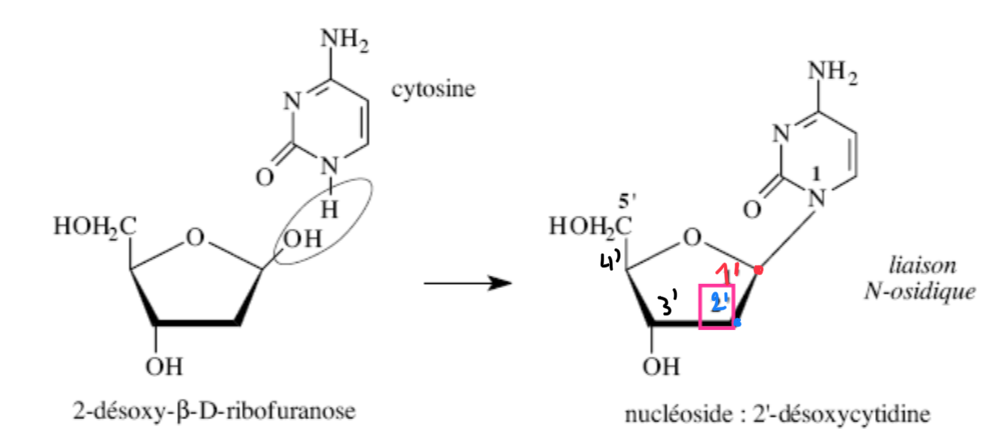 Tuteur Solution lucil_e_tubaire Posted October 1 Tuteur Solution Posted October 1 (edited) Coucou !! La base va toujours se lier au carbone 1’ de l’ose (ribose ou désoxyribose) par liaison N-osidique pour former un nucléoside. Ce qui va changer éventuellement c’est quel atome de la base qui va être lié : - l’azote N1 pour les pyrimidines - le N9 pour les purines tu peux le voir sur ce schéma, qui représente la cytidine : En espérant que ça répond à ta question !! Edited October 1 by lucil_e_tubaire jujéjunum, An-Schwann, Carence and 1 other 4 Quote