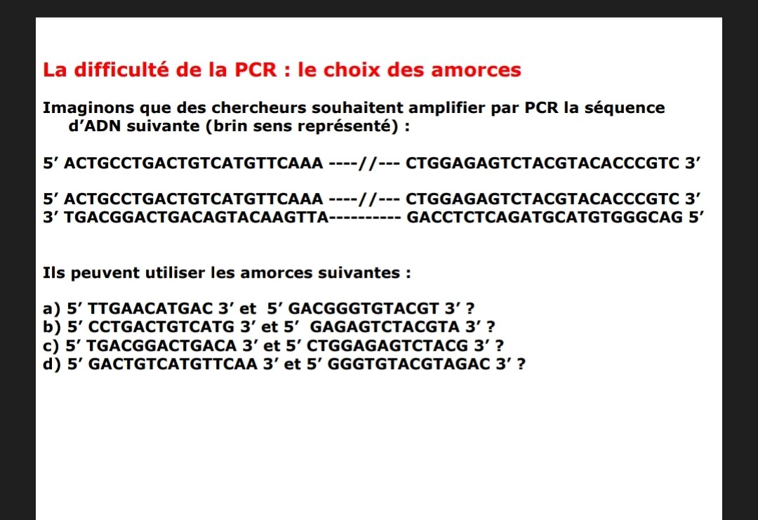 Tuteur Solution Lénadénine Posted October 3 Tuteur Solution Posted October 3 Salut! Effectivement il y’a une super fiche dans la librairie qui explique pas à pas la méthodologie à adopter face à ce genre de QCMs. Si jamais tu ne trouves pas n’hésite pas à me dire. Mais pour essayer de t’aider sur ce QCM je vais essayer de t’expliquer la démarche à suivre. Ici tu as une première séquence avec le brin sens représenté et ce qui est en dessous est la reprise du brin sens avec son brin complémentaire (brin anti sens). Il faut que tu saches que l’amorce 1 (celle qu’on te donne en premier dans les item en général) est celle qui est complémentaire au brin anti sens (donc qui est identique au brin sens). Avec ces infos on peut déjà éliminé les item A et C qui sont fausses car les amorces 1 ne sont pas complémentaires au brin anti sens de cet ADN (ne sont pas identiques au brin sens). L’amorce 2 (celle qu’on donne en deuxième en général dans les items) quant à elle, elle est complémentaire au brin sens (donc identique au brin anti sens). On se rend donc compte que l’item B ne correspond pas donc c’est faux. Je veux rajouter aussi qu’il faut faire attention au sens de lecture 5’-3’ ou 3’-5’ parce que il est possible que les amorces soient écrites dans les deux sens donc il faut être ultra vigilant et une erreur est vite arrivée. L’item vrai est donc l’item D car les deux amorces correspondent bien pour cette PCR. J’espère avoir pu t’aider, n’hésites pas si tu as d’autres questions ! POMME, Émolyse, lucil_e_tubaire and 4 others 2 2 3 Quote