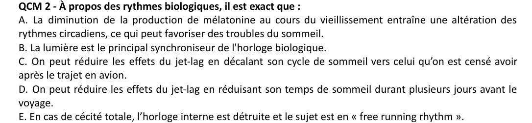 Tuteur Solution rivaRoxanneban Posted October 5 Tuteur Solution Posted October 5 Coucou, je suis d’accord, En effet, pour l’item C on parle d’une adaptation préalable au voyage (se coucher plus tôt que d’habitude ou plus tard et se réveiller plut tôt ou plus tard) tandis que dans l’item D on parle d’une perte de sommeil, ce qui est inutile car cette dette de sommeil amplifiera même les effets du jet lag. En espérant t’avoir aider ! lucil_e_tubaire, etteblabla, Méphysiophélès and 1 other 2 1 1 Quote