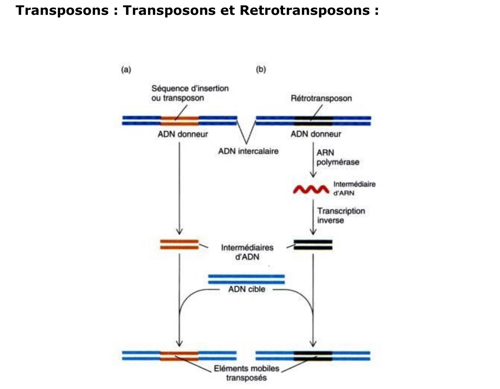Tuteur Solution Célintestin Posted October 7 Tuteur Solution Posted October 7 Les transposons sont des éléments moyennement répétés et mobiles du génome que l’on retrouve chez les procaryotes et les eucaryotes. Ils ont la capacité de se déplacer d’un site à l’autre de l’ADN, cependant cela reste des évènements rares. Ils ont un rôle notamment dans la régulation de l'expression génique et dans le transfert de fonctions (les rétrotransposons virales représentent 10 à 15% du génome des mammifères et même plus pour les végétaux). Les transposons peuvent être codant ou pas. Ils codent notamment pour des protéines nécessaires à la transposition (transposases) ou alors à d’autres protéines. La professeur utilise l’exemple des éléments IS qui sont une version miniature des transposons puisqu’ils codent seulement les protéines nécessaires à la transpositions. Les trasnposons se déplacent de site en se détachant d’un ADN donneur pour ensuite s’insérer dans l’ADN cible. Tandis que les rétro transposons se déplacent de site à travers un mécanisme plus complexe car il y a d’abord la transcription de la séquence en ARN, puis cet ARN subit une transcription inverse créant une séquence d’ADN qui va pouvoir s’insérer dans l’ADN cible. Si ces insertions surviennent au milieu d’un gêne, elles vont inactiver sa transcription. La professeur l’illustre avec les grains de mais qui exprimaient un pigment les rendant violets mais qui suite à des transpositions la transcription du pigment a été inactiver les rendant jaunes. J’espère avoir répondu à ta question, n’hésite pas si tu à besoin de plus de précision ! Lénadénine, emma-tie, jujéjunum and 1 other 2 2 Quote