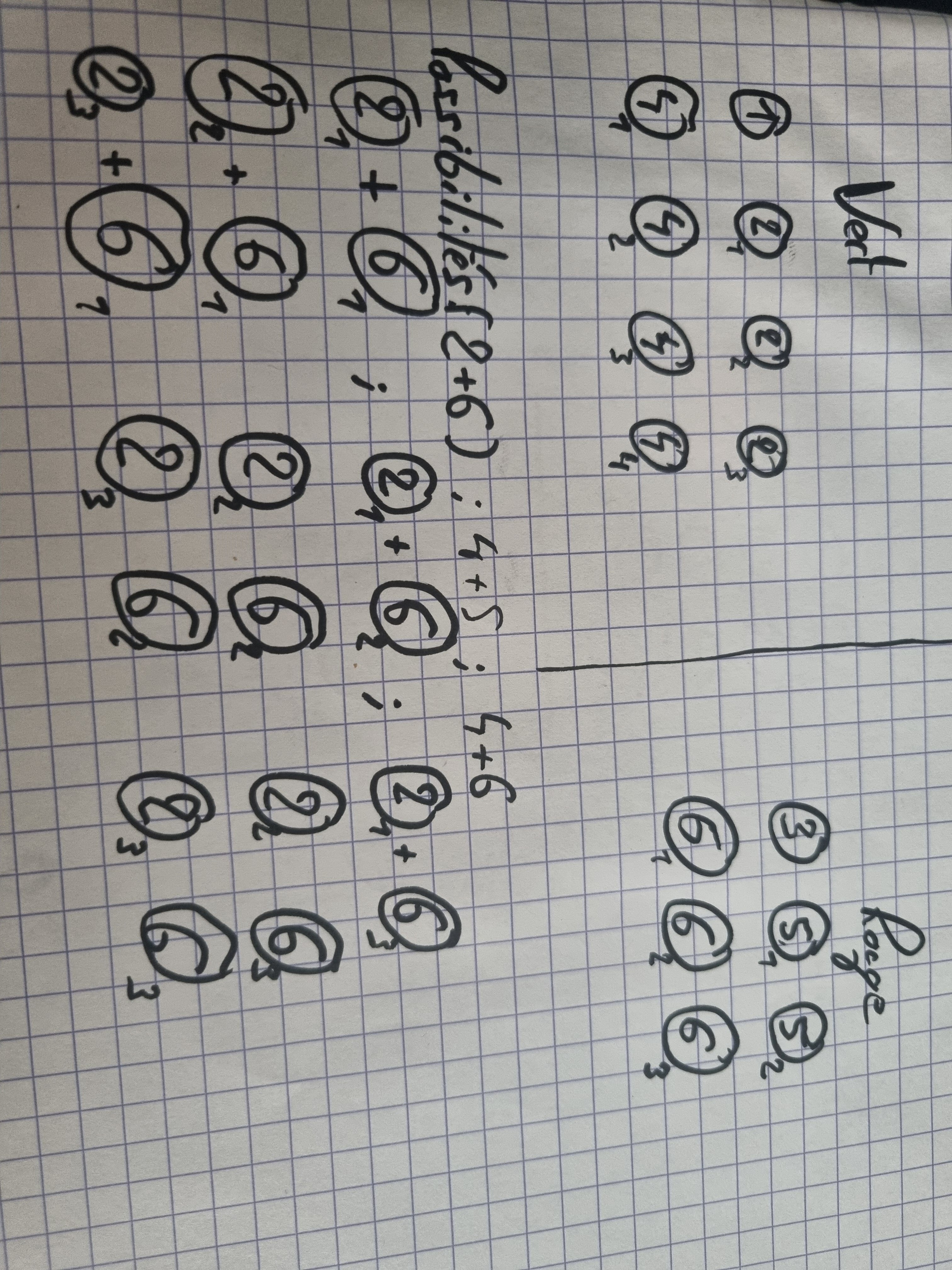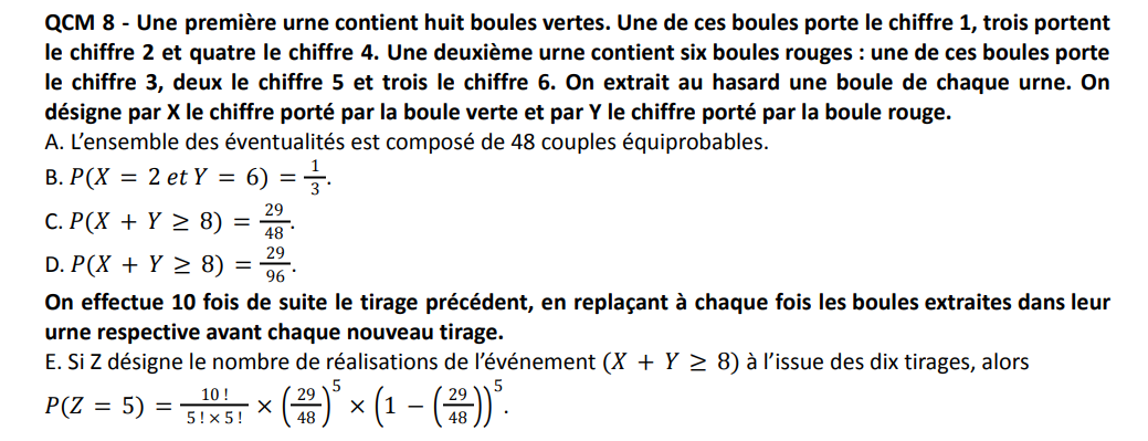 Tuteur Solution ethanastomose Posted October 9 Tuteur Solution Posted October 9 Coucouuu!!! Alors pour cet item il faut compter toutes les possibilités que la somme de la boule verte et de la boule rouge soit supérieure ou égale à 8. On a 6 boules rouges et 8 boules vertes donc ça nous fait un total de 48 possibilités et si on compte celles de faire plus ou d'être égal à huit c'est un peu long à faire mais au final on a bien 29 possibilités. Sur les 10 tirages on veut savoir quelle proba on a d'avoir au moins 5 fois une somme supérieure ou égale à huit et je pense que ton Z=3 vient du fait que tu n'as pas compté toutes les possibilités avec toutes les boules, hésites pas à faire un petit dessin c'est plus pratique de dessiner toutes le boules et de compter avec ça,( je t'envoie le début avec les 2+6). Je suis d'accord avec toi on a 3 possibilités (2+6; 4+5; 4+6) mais plusieurs boules portent ces numéros donc par exemple pour les 2+6 on à 9 chances car il y a 3 boules verte n°2 et 3 boules rouges n°6 donc 3x3=9 et si tu fais ça pour les 4+5 et 4+6 tu tombes sur 29 possibilités. Après la formule est bien la bonne avec la bonne proba donc l'item est tout juste J'espère avoir pu t'éclairer sinon hésites pas à renvoyer un message jooo, ja-dénosine4, Nesss and 4 others 6 1 Quote