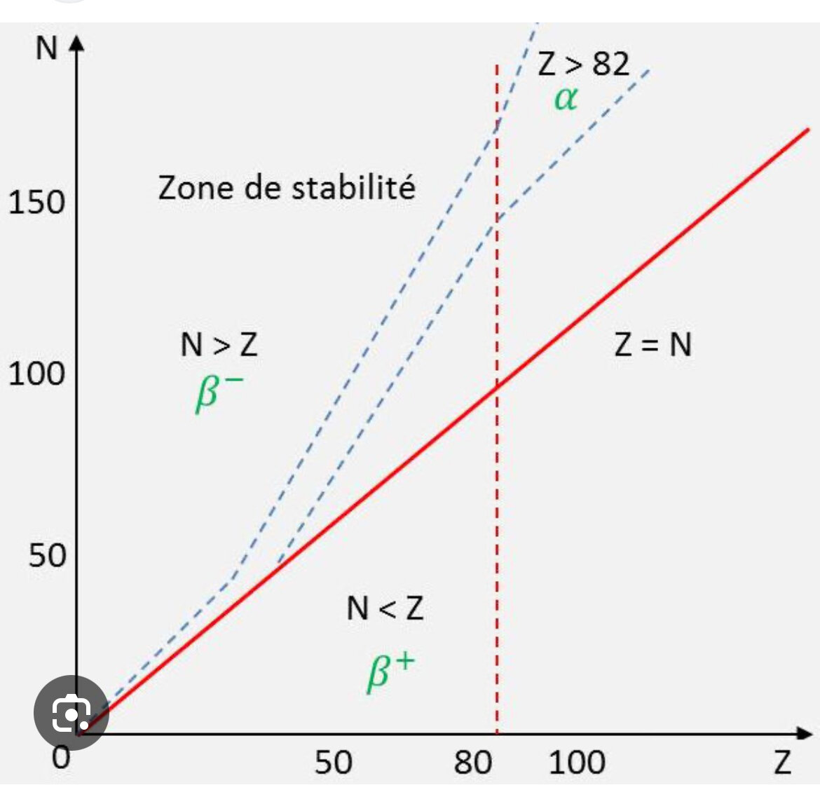 Tuteur AlexiARNr Posted October 9 Tuteur Posted October 9 Coucou!! Alors un noyau est stable quand la force nucléaire (attractive) compense la répulsion électrostatique entre protons. Cette stabilité dépend du rapport N/Z : Avec N = nombre de neutrons Et Z = nombre de protons Mais ce rapport n’est pas constant pour tous les éléments c’est là qu’intervient la fameuse vallée de stabilité. Tu n’as pas besoin de retenir le graphique. Ce qu’il faut, c’est savoir interpréter ta position par rapport à la vallée de stabilité : - si ton noyau a trop de neutrons (N trop grand ->au-dessus de la vallée) alors c’est une instabilité bêta - -si ton noyau a trop de protons (N trop petit ->en dessous de la vallée) c’est une instabilité bêta + ou CE - si ton noyau est trop lourd (Z≈ 83) c’est une instabilité alpha Quote