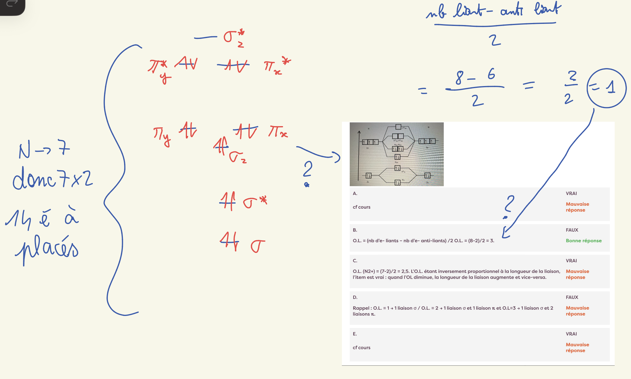 Tuteur caro.tide Posted October 11 Tuteur Posted October 11 Salut ! Pour la moledule N2, N a 7 electrons comme tu l'as noté, donc on peut noter N : 1s22s22p3. Lorsque tu fais le diagramme LCAO, en general on ne note pas la couche 1s puisqu'on sait que s'il y a les couches 2s et 2p, la 1s est forcement remplie. Donc pour se faciliter la tâche, on note seulement la couche de valence qui est la couche 2, où il y a seulement 5 électrons et non pas 7. Ce qui fait que la couche pi antiliante de ton diagramme LCAO ne contient aucun éléctrons. Et l'O.L est donc bien égale à 3. J'espère avoir pu t'aider dis-moi si ce n'est toujours pas clair ! anaé.sthésie, Daryanémie, Lénadénine and 1 other 1 3 Quote