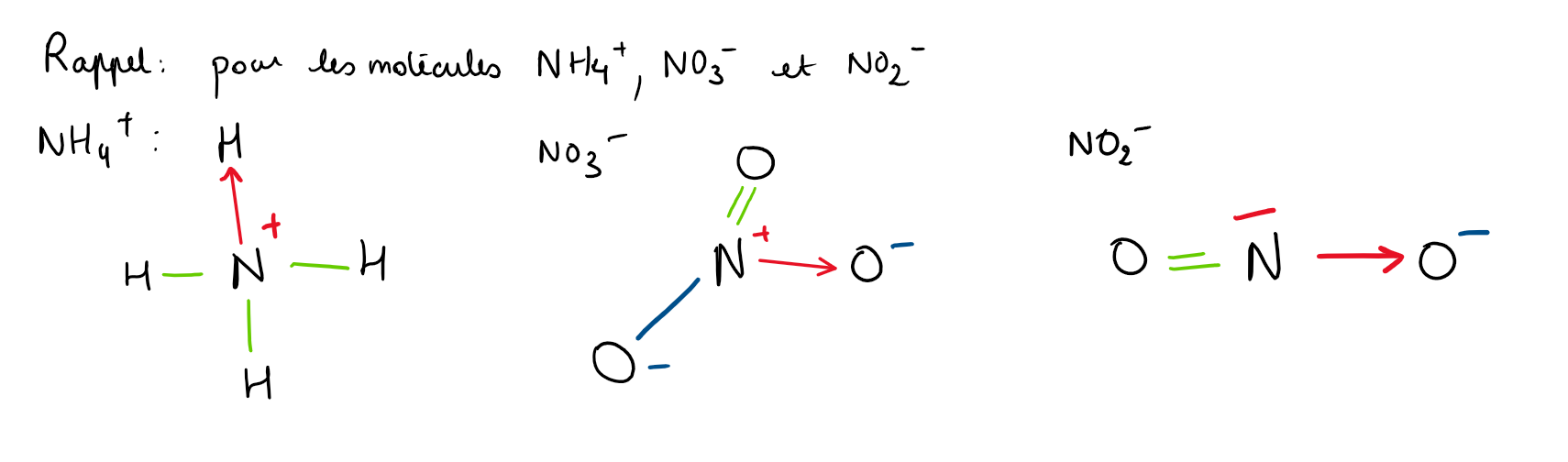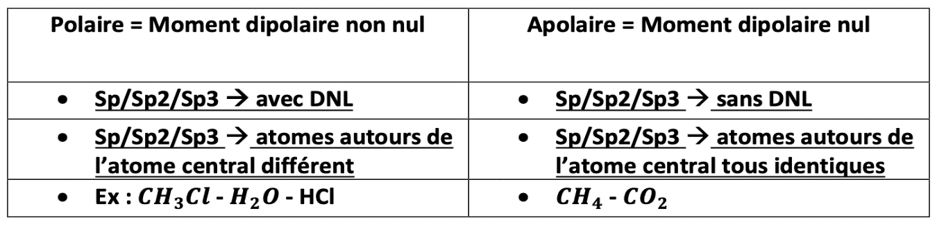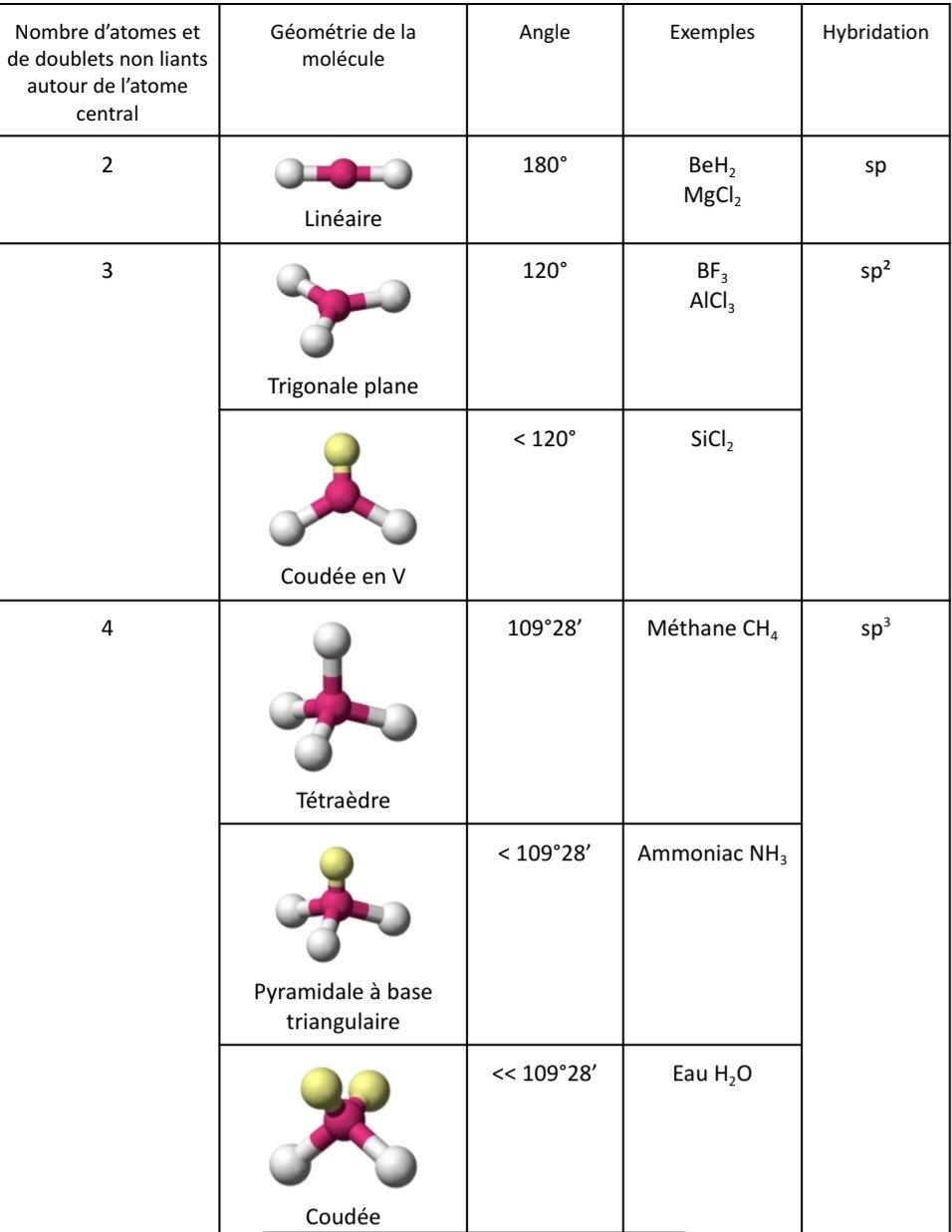 Tuteur Solution caro.tide Posted October 11 Tuteur Solution Posted October 11 Salut ! Pour l'hybridation, il faut que tu comptes le nombre de liaisons sigma et de doublets non liants qu'a l'atome concerné et que tu soustrais 1 à ton résultat. Pour faire simple, compte le nombre d'atomes auquel est lié l'atome dont tu veux connaitre l'hybridation et ses doublets non liants (s'il en a) et enlève 1. Dans le cas du NH4+: pour trouver l'hybridation de l'atome N, il faut compter le nombre d'atomes auquel il est relié. Dans ce cas, il est lié à 4 atomes H, donc tu fais le calcul: 4-1=3 (les 4 atomes auquel il est lié moins 1). Dans cette molécule N est donc hybridé sp3. Dans le NO2-: l'atome N est lié à 2 atomes O et a 1 doublet non liant. Tu calcules donc: (2+1)-1=2. N est donc hybridé sp2 dans cette molécule. Pour NO3-: N est lié à 3 atomes O et a 0 doublet non liant, tu fais donc le calcul: (3+0)-1=2. Donc N est aussi hybridé sp2 dans cette molécule. En ce qui concerne les géométries des molécules, il faut se référer au tableau que je te remets ci-dessous. Il faut que tu regardes le nombre d'atomes (en blanc) liés à l'atome central (en rose) et si cet atome central possède des doublets non liants (en jaune). Dans la molécule NH4+: N (atome central en rose) est lié à 4 atomes (H en blanc) et ne possède pas de doublet non liant. Donc NH4+ a une géométrie tétraédrique et non pas pyramidale. Pour les fiches, je n'en ai pas à te proposer personnellement, essaye de voir si qqun n'en a pas mis sur le forum en chimie, et sinon je te conseille de regarder les corrections des QCMs dans le poly de chimie qui peuvent t'aider à t'entrainer aussi. J'espère avoir pu t'aider, dis-moi si ce n'est pas clair ! Je viens de trouver ce tableau qui résume un peu toutes les géométries des molécules, si ça peut t'aider ! Aleksandra, Bastitine, Lénadénine and 2 others 2 1 2 Quote