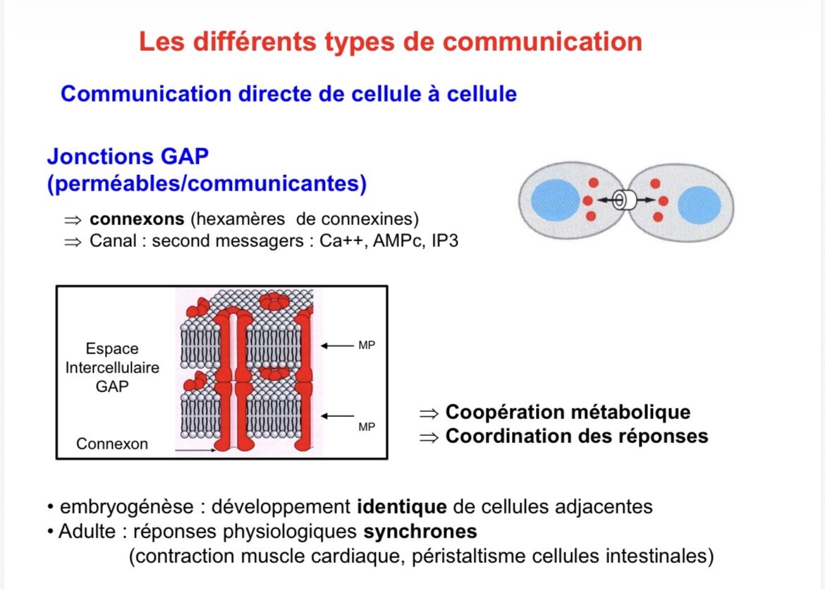 Responsable Matière An-Schwann Posted October 13 Responsable Matière Posted October 13 7 minutes ago, Lexie31 said: L’embryogenese n’est pas cité sur ce diapo mais le précédent sur les gap jonctions comme on peut le voir ci dessous Oui l’embryogenèse n’est pas cité directement, mais il est cité « développement », qui compte l’embryogenèse. J’avoue cela peut être ambigu, puisqu’il est directement cité dans le cas des GAP junctions. En tout cas les contacts directs sont bien impliqué lors du développement pendant les période de l’embryogenèse. Puisque ec’est vrai que c’est pas directement dit, on va voir si on annule l’item ou pas Nentiqu 1 Quote