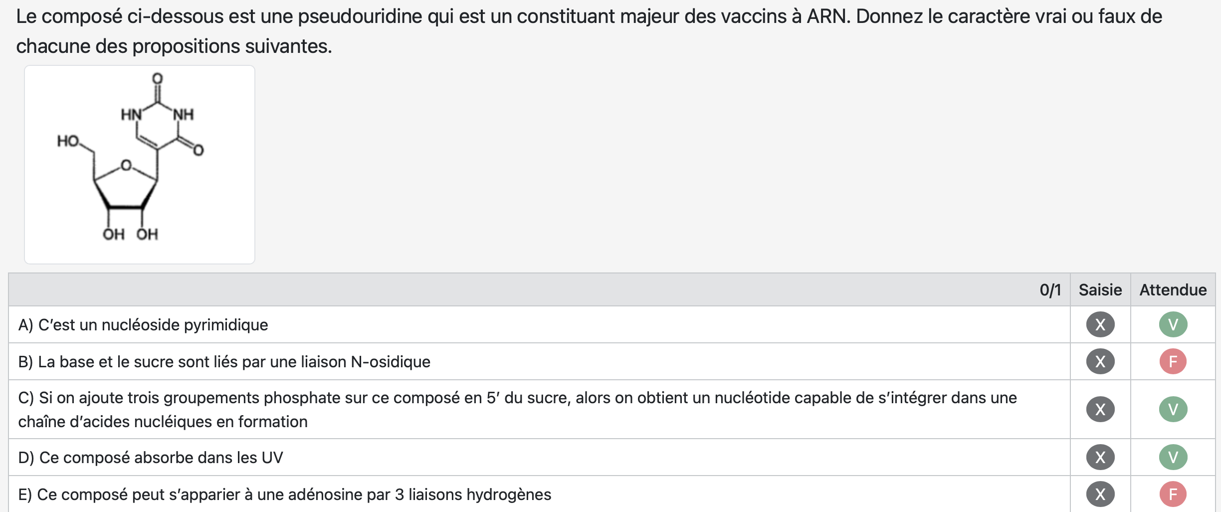 Tuteur Solution Penicilline Posted October 18 Tuteur Solution Posted October 18 Hello ! Voici une petite synthèse concernant la pseudouridine. La pseudouridine est un nucléotide particulier qui a pour base un uracile mais avec une liaison C-odidique (sucre lié en C5 de l'uracile) au lieu de la liaison N-osidique habituelle. Il s'agit d'une modification post-traductionnelle. Dans le cours il me semble qu'on en parle que pour l'ARNt dans la boucle TΨC, mais tu peux effectivement la retrouver dans d'autres ARN. Pour les QCMs je pense que tu devras surtout la reconnaître sur un schéma et dire si ce que c'est en fonction de la question. Par exemple Annale 2022-2023 QCM 18 Est-ce que cette séquence schématique peut être retrouvée dans un ARN ? : Révélation VRAI : il s'agit d'un ARNt (boucle TΨC) Après sinon le piège serait de te parler d'un pré-ARN, comme il s'agit d'une modification post-traductionnelle ce serait faux. Pour le QCM que tu as envoyé, je ne sais pas trop de quelle erreur tu parles mais il s'agit bien d'un nucléoside (base + sucre sans phosphate) pyrimidique(base uracile) En revanche je me me pose des questions sur l'item C : en effet on obtient la pseudouridine en post-traductionnel donc on n'en n'a pas dans une chaîne en formation. Pour moi l'item est FAUX. (J'en parle à mes co-tuteurs et je reviens vers toi) jujéjunum, Lukapoptose, Lénadénine and 2 others 1 1 3 Quote