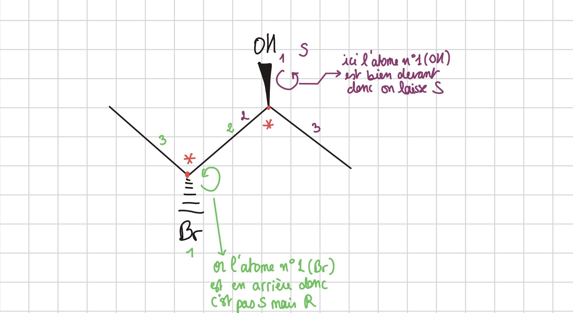 Tuteur Solution danadal Posted October 19 Tuteur Solution Posted October 19 Salut ! Si j’ai bien compris ta question, quand on te montre une molécule avec seulement trois substituants visibles autour d’un carbone asymétrique, le quatrième c’est très souvent un hydrogène qu’on ne représente pas, mais il faut quand même vérifier son orientation : il n’est pas toujours derrière par défaut. Du coup avant de déterminer si c’est R ou S il faut s’assurer que l’H (ou le groupe de plus faible priorité) soit bien placé derrière. S’il ne l’est pas, il faut faire une rotation mentale ou redessiner la molécule pour remettre tout dans le bon sens. Tu peux passer d’une représentation à une autre, c’est tout a fait possible, Ou bien tu peux très bien le faire en projection de Cram c’est même pour moi la plus pratique pour ce genre d’exercice ensuite tu classes les trois autres substituants selon le numéro atomique du plus grand au plus petit et tu regardes le sens 1 → 2 → 3. Si c’est dans le sens horaire, c’est R. Si c’est dans le sens antihoraire, c’est S. Par contre si ton hydrogène (ou substituant 4) est devant au lieu d’être derrière il faut inverser le résultat : ce qui aurait été R devient S, et inversement. Je t’ai fait un exemple, comme tu peux le voir les 4eme substituants sur les deux C asymétriques ne sont pas représentés sur la molécule, ce qui signifie que ce sont des H, et vue qu’on a deux atomes plan et un atome devant pour le OH, et bien le H est derrière, alors que pour le C* portant le Br, le H est devant puisque le Br est derriere. Et puis tu les classe selon leur numero atomique et tu détermine si c’est S ou R. Voila j’espere que c’est assez claire, n’hésite pas si t’as des questions ! Ankyyrine 1 Quote