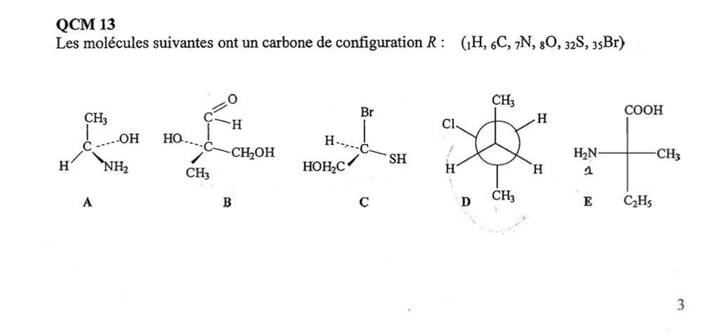 Tuteur Solution Aleksandra Posted October 19 Tuteur Solution Posted October 19 (edited) Coucou, Ta molécule D ne possède qu'un carbone asymétrique qui est le carbone n°3. Donc tu ne peux avoir que la configuration R que tu as trouvée !! Donc l'item est juste. Fait attention quand tu cherches la configuration d'une molécule à bien regarder tes carbones asymétriques !! Puisqu'un carbone non asymétriques n'a pas de configuration possible. Et quand tu compares 2 molécules pour savoir si elles sont énantiomères, regarde si tu as les mêmes groupements d'atomes et si tu as des carbones asymétriques en même proportion. Et tu regardes qu'il n'y a pas de plans de symétries sinon on a des composés méso et pas des énantionmères. Voilà, bonne fin de week-end à toi ;) Edited October 19 by Aleksandra Ankyyrine and Medhd 2 Quote