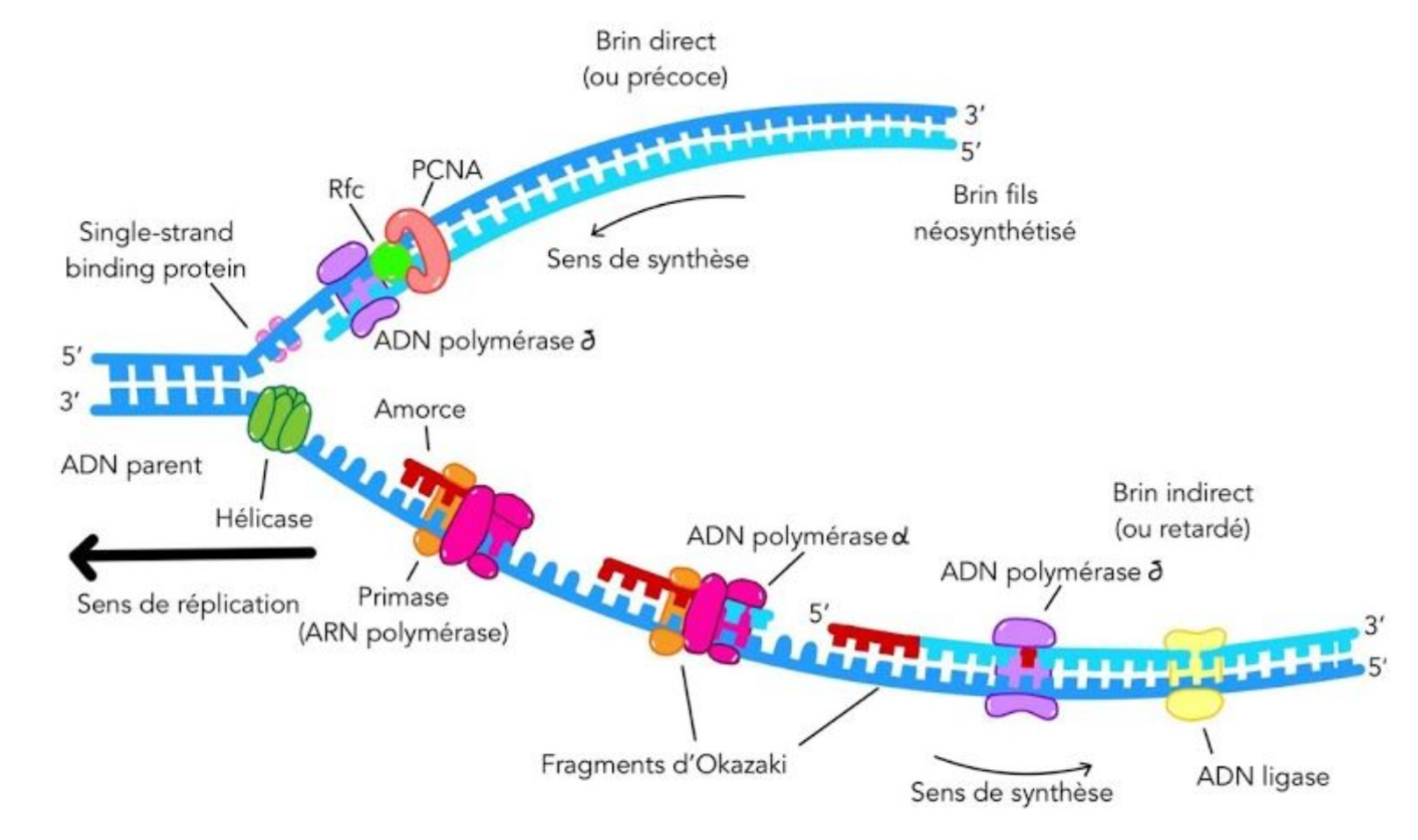 Tuteur Solution lucil_e_tubaire Posted October 19 Tuteur Solution Posted October 19 Coucou, je viens compléter la réponse de @brownie :)) De manière générale : l‘Extremité 5’ correspond au début de ta molécule, que ça soit de l’ADN ou de l’ARN. Le 3’ correspond à la fin. Pourquoi ? Parce que lorsque tu synthétises (tu élongues) ton brin d’ADN, que ça soit pendant la réplication ou la PCR, l’extremité 5’ du nucléotide va venir se lier au nucléotide qui le précède son l’extremité 3’. Pour que ça soit plus clair je te propose ce petit schéma : https://ibb.co/TxRTvJrK Là où la prof a insisté, c’est que les polymérisés synthétisent toujours l’ADN de 5’ en 3’ : quand tu vois ta molécule d’ADN en entier tu vois bien que le 1er nt a son extremité 5’ de libre, non accrochée à un autre nt, alors que le dernier nt de la molécule a son extremité 3’ reliée à un OH et pas un autre nt, donc ça nous donne le sens 5’3’ !! L’exception à la règle ce sont les ADN Polymérises translesionnelles : elles elles sont capable de regarder en arrière, de 3’ en 5’, pour pouvoir corriger les erreurs. C’est ce qui va permettre par exemple d’éliminer les amorces pendant la réplication ou la PCR. Pour ce qui est du brin leader : C’est celui que l’on va synthétiser de manière continue. Pourquoi ? Parce qu’il fait une synthèse de 5’ en 3’ donc tout se passe à merveille. L’autre brin, suiveur ou retardé ou tardif, va AUSSI être synthétisé de 5’ en 3’ mais en utilisant un moyen détourné, les fragments d’okasaki. Pourquoi ? Parce que la synthèse va se faire vers l’œil de réplication, et pas dans le sens de la fourche, alors que l’ADN aimerait bien être synthétisé dans le sens de la fourche. Ils sont toujours synthétisés de 5’ en 3’ parce que comme on l’a dit dès que c’est synthèse d’ADN c’est 5’3’. Ça te fait donc une synthèse discontinue, qui sera complétée par l’action des ligases (et à la fin tu auras un brin tout propre tout nickel). Je te renvoie aux diapos 19 et 20 de Mme Couderc de son cours 4 et 5, elle a mis des schémas qui illustrent très bien !! Courageeeee @letartare06 pour mieux comprendre les flèches et ce qu’elles représentent : va voir le diapo de la prof !! 1) les courtes flèches du début représentent les amorces d’ARN 2) les longues flèches représentent l’ADN synthétisé de manière continue 3) les courtes flèches qu’on ajoute ensuite représentent les fragments d’okasaki :) vers la fin de la réplication tu auras tes amorces d’ARN remplacées par de l’ADN par les translésionnelles, puis l’action des ligases qui lient l’ADN synthétisé par les translésionnelles et l’ADN discontinu synthétisé par les polymérases. Androma, Émolyse, jujéjunum and 3 others 1 1 3 1 Quote