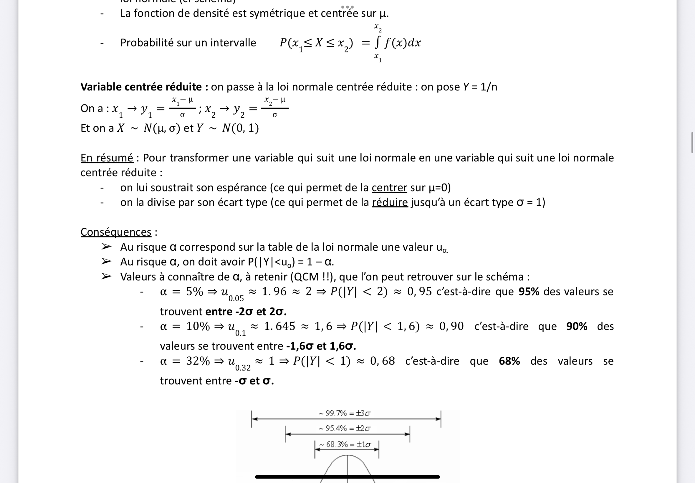 Tuteur Solution Helocoucou Posted October 19 Tuteur Solution Posted October 19 Salut ! Alors je vais t’expliquer ça : On transforme la variable X(note) en variable centrée réduite Z: Z=X−μ/σ Ainsi, Z suit une loi normale centrée réduite N(0,1). QCM C : Z=19−5/2=4/2=2Z=2 Donc : P(X>19)=P(Z>2) P(Z>2)=2,5% L’énoncé dit : 2,5 % ont une note supérieure à 19 → vrai QCM E : Z=(17−15)/2=2/2=1 Donc : P(X>17)=P(Z>1) P(Z>1)= 16% Or 1/6=0,1666≈16,7% Donc c ‘est vrai Il faut connaître par cœur trois valeurs principales de la loi normale centrée réduite (pas besoin de table) : Pour Z = 1, environ 16 % des valeurs sont au-dessus. Pour Z = 2, environ 2,5 % des valeurs sont au-dessus. Pour Z = 3, environ 0,15 % des valeurs sont au-dessus. C’est grâce à cette partie du cours ci-jointe J’espère que ça t’as aider ! Hésite pas si tu as une question ! Bon courage ! ja-dénosine4, OnNeGiflePasLeVent, Hélie and 2 others 2 1 1 1 Quote