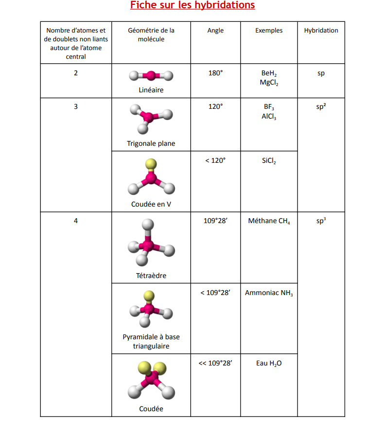 zigoto Posted October 21 Posted October 21 Salut Alors je suis pas tuteur mais je vais essayer de t'aider sans dire de bétise pour connaitre la géométrie de la molécule tu peux t'aider de se tableau que j'ai trouvé sur tutoweb. si je prend l'exemple de l'ion CO32- lorsque tu déssine ta molécule tu trouve que le carbone fait toutes ses liaision (il n'a pas de non liant) et tu sais que la molécule est hybridé sp2 tu regarde alors dans le tableau et tu vois que la molécule est trigonale plane. Je sais pas si mon expliquation est claire mais j'espere que t'as compris Bonne journée a toi Bastitine 1 Quote