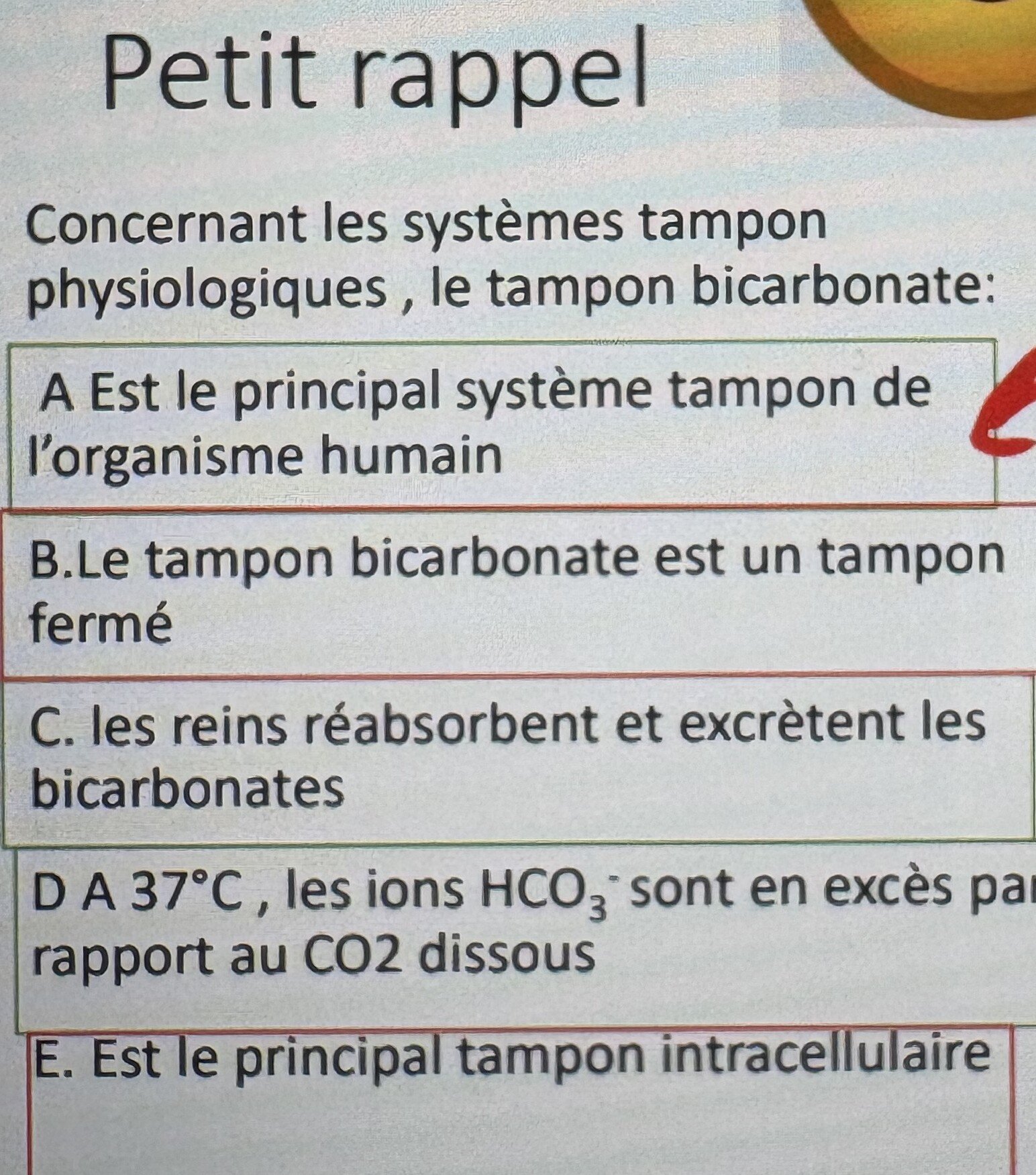 Tuteur Solution noidonthaveagun Posted October 23 Tuteur Solution Posted October 23 Coucou @Flogo ! Alors de base, comme c'est la prof qui fera ce qcm, part du principe que si c'est dans son cours c'est que c'est cette réponse qu'elle attend. Ca peut arriver de trouver des erreurs dans les QCM, l'important c'est ce qu'elle a dit en cours. En l'occurrence, dans les QCM mis en pièce jointe il y a marqué que le tampon bicarbonate est un système ouvert car les reins réabsorbent et excrètent le bicarbonate, on a donc bien une ouverture vers l'extérieur du corps. Tu as du t'emmêler les pinceaux, mais le tampon bicarbonate est bien un système ouvert. Cotytylédon, aangelee, Lolordose and 2 others 3 1 1 Quote