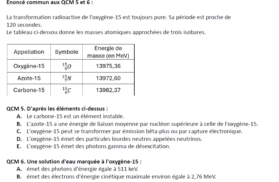 Rif-Power Posted October 24 Posted October 24 Bonjour, dans l'examen blanc 2024-2025, je ne comprends pas comment calculer l'énergie des photons émis par l'oxygène-15 dans le QCM 6, Item A ci-dessous. Dans la correction du tutorat l'item A est vrai donc la correction n'est pas détaillée. Merci d'avance. Lolordose 1 Quote