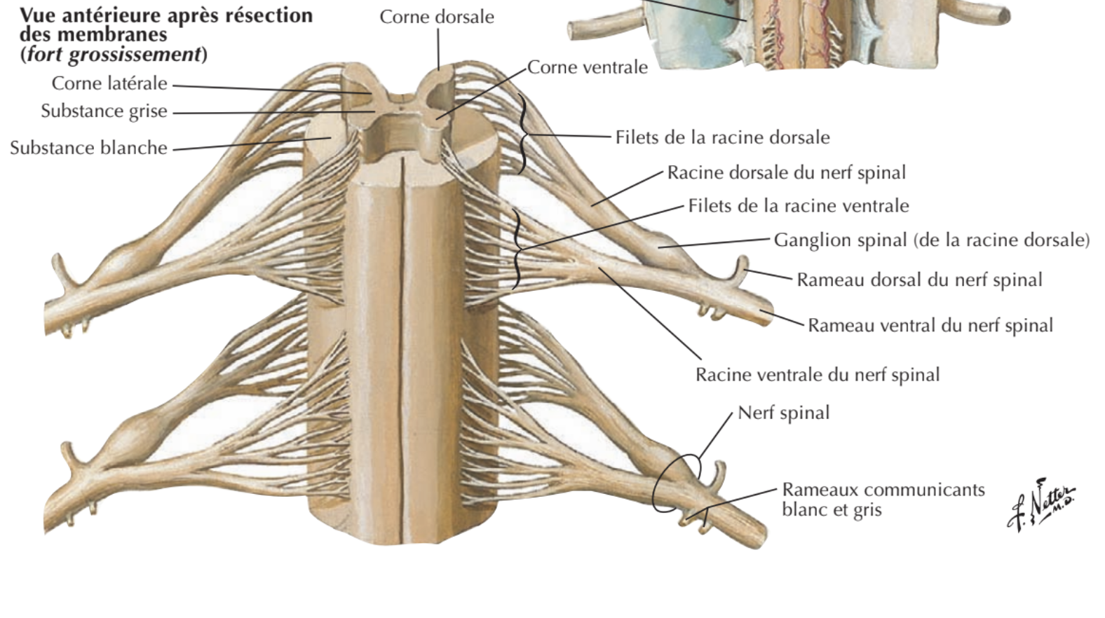 Tuteur Solution matthieucaryote Posted October 25 Tuteur Solution Posted October 25 Salut, Alors, je n'ai pas l'item donc je ne sait pas trop de quoi il en retourne. Je te met un schéma pour mieux comprendre. Mais pour faire simple, le nerf spinal est celui qui va émerger de la moelle allongé ("épinière") au niveau de chaque vertèbre et de chaque côtés (droite et à gauche en dorsal et en ventral). Ces nerf spinaux sont donc à différencier des nerfs crâniens. Lorsqu'ils émergent de la moelle, il y a plein de petits filets qui se rejoignent pour former le nerf: c'est la racine. Ensuite ces nerfs ont un ganglion proximal qui fait suite à la racine. Après le ganglion, le nerf va se diviser en différentes branches (rameaux sur le schéma. La correction de l'item insiste donc sur le fait que selon les branches et les racines, on ne fait pas passer le même type d'informations Voilà j'espère avoir répondu à ta question et que c'était suffisamment clair. N'hésites pas si tu as d'autres questions ou besoin d'éclaircir un point ! Bonnes révisions et bon courrage :) thomASTROCYTE, Dodopamine2.0 and tahou 1 1 1 Quote