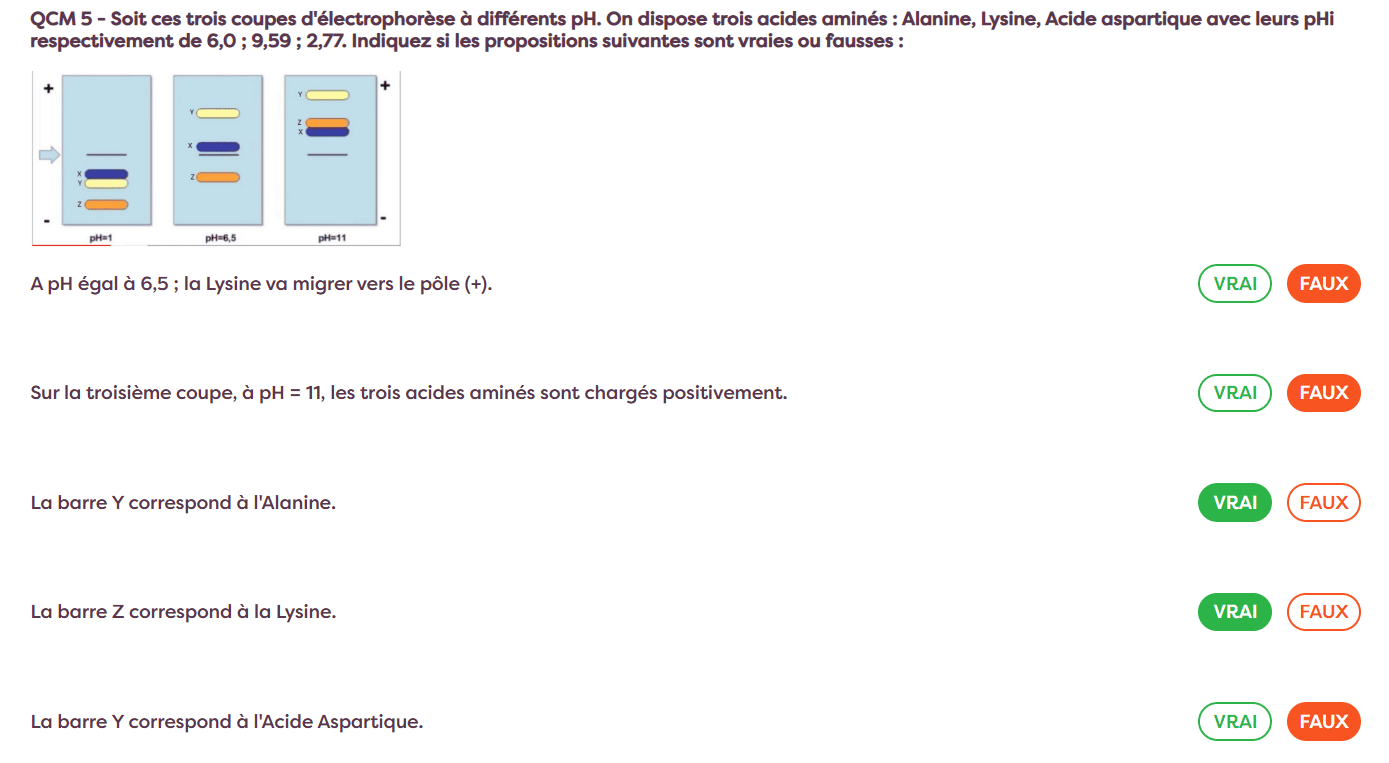 GlutaMathieu Posted October 26, 2025 Posted October 26, 2025 (c'est un QCM sur tutoweb) Les AA en question sont Ala , Lys et Asp Les pHi donnés : - Asp 2,77 - Ala 6 - Lys 9,59 La correspondance des bandes donnée dans la correction est X = Ala, Y = Asp, Z = Lys Or ça ne me paraît pas logique, car pour moi ici vu que les 3 sont chargés positivement les "plus positifs" en charge vont aller le plus loin vers la cathode, donc la bande Y serait Ala car pHi plus haut que celui d'Asp donc AA plus positif dans ces conditions En gros, j'ai trouvé : - X = Asp - Y = Ala - Z = Lys Et la correction n'est pas du même avis ahah Je fais une erreur de raisonnement ou c'est un errata de correction ? Quote