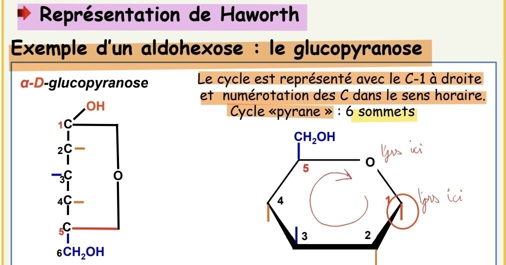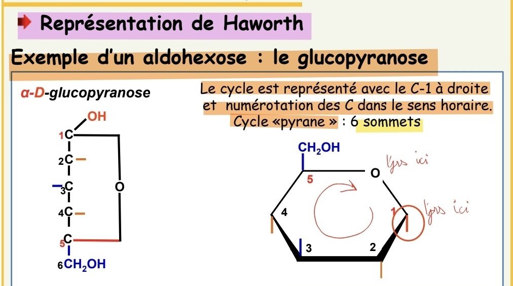 Flogo Posted October 30 Posted October 30 bonjour, j'arrive pas à comprendre comment on fait pour passer de la forme à gauche de la 1 image à celle de droite donc celle de Haworth. De plus je ne comprend pas pourquoi les trait qui sont sur la figure de gauche toujours dans la 1er image sont dans tel ou tel position je prend comme par exemple la CH2OH pourquoi elle est en haut dans l'image 1 au lieu d'être en bas comme dans l'image 2 merci d'avance Quote