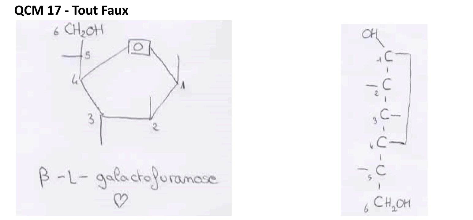 aly_1601 Posted October 31 Posted October 31 Bonjour, j'ai une question sur la cyclisation des glucides. J’ai un peu de mal lorsqu’il s’agit de passer de la forme cyclisée à la forme linéaire. Et je ne comprends pas la correction du QCM 17 dans le poly de biochimie. Il me semble que, lorsque le trait est vers le haut, alors le groupe OH est orienté vers la gauche, et lorsqu’il est vers le bas, alors c’est à droite sur la forme linéaire, sauf pour le 5ᵉ carbone où c'est l’inverse (je crois). Cependant, dans le QCM 17, le trait du carbone 1 est orienté vers le haut, mais dans la forme linéaire il se retrouve à droite et je comprend pas pourquoi. Merci d'avance ! Quote