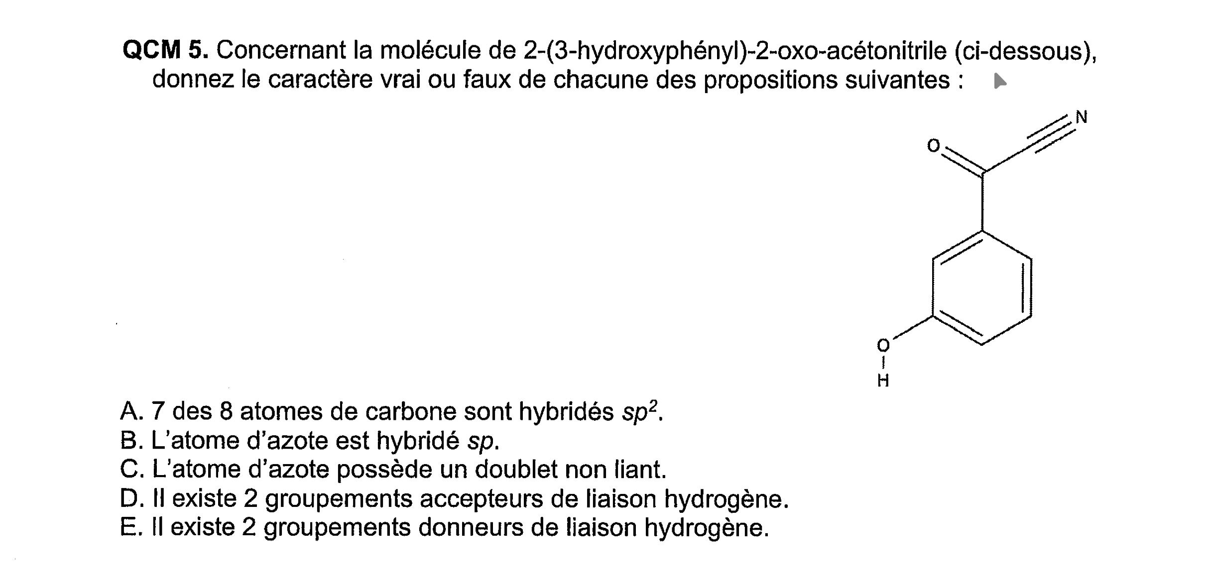 letartare06 Posted October 31 Author Posted October 31 il y a 20 minutes, danadal a dit : Salut ! Pour pouvoir répondre a ta question c’est de cet exo dont tu parles ? @danadal non c'est celui-ci QCM 5. Concernant la molécule d'ozone (8)- dont les atomes d'oxygène ne peuvent pas être arrangés sous une forme triangulaire et former une structure cyclique, donnez le caractère vrai ou faux de chacune des propositions suivantes A. Dans la molécule de O, l'atome d'oxygène central est hybridé sp2. B. La molécule de est linéaire. C. La molécule de présente 6 doublets non-liants. D. Le moment dipolaire global de la molécule de est nul. E. La molécule de est constituée de deux liaisons et une liaison . Quote