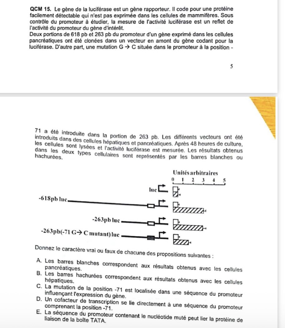 Tuteur Solution Lénadénine Posted November 2 Tuteur Solution Posted November 2 Coucou ! Je vais essayer de t’expliquer ça comme je peux et si jamais tu comprend pas quelque chose n’hésite vraiment pas à me dire ! Alors déjà il faut que tu saches que la luciferase seule comme dit dans l’énoncé n’est pas exprimé chez les mammifères c’est à dire que si on l’étudie comme dans le premier cas « Luc » on ne verra pas d’expression vu qu’on étudie son expression dans les cellules pancréatiques et hépatiques. On te dit dans l’énoncé que l’expression de la luciferase est le reflet de l’activité d’un promoteur, en fait c’est un gène rapporteur c’est à dire que grâce a son expression on pourra en déduire l’activité du promoteur. En gros pour que ce gène soit transcrit puis traduit en protéine qu’on peut détecter il lui faut absolument ce promoteur qu’on étudie. Dans ce genre d’exercices il faut pas avoir peur de la longueur de l’énoncé vraiment en général tout est dit dedans ! Ensuite pour les items: À: Faux, on te dit que le promoteur inséré est celui d’un gène exprimé dans les cellules pancréatiques donc il ne pourra pas y avoir d’activité luciferase dans les cellules hépatiques qui correspondront donc au carré blanc B: Faux, pour la même raison que le À, c’est donc ici les cellules pancréatiques en hachurés. C. Vrai, en effet on voit une diminution de l’activité dans les cellules pancréatiques par rapport à l’étude de la partie 263 du promoteur sans mutation. D. Je dirai vrai mais je ne suis pas sûre (si un autre tuteur pourrait confirmer) E. Faux, la boîte TATA se trouve à environ 25/30 nucleotides en amont du site +1 donc pas à -71. Voila j’espère que c’est plus clair pour toi ! N’hésitez vraiment pas si tu as besoin ! Bon courage ! Passpss, Petit_Macrophage, lucil_e_tubaire and 3 others 1 1 1 2 1 Quote