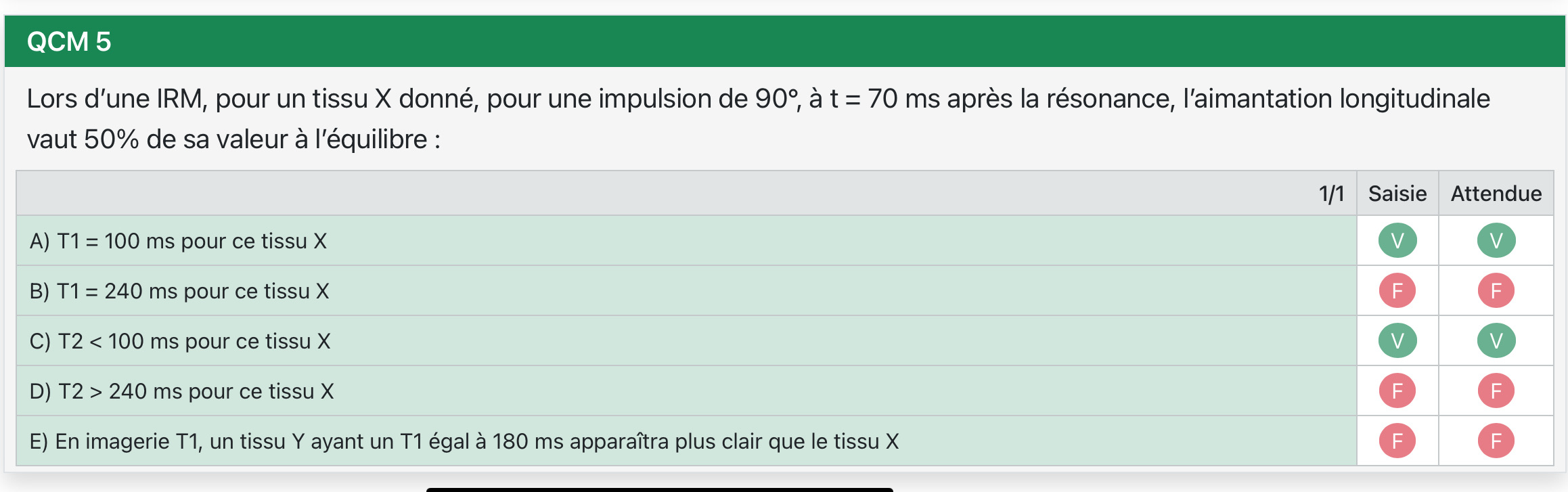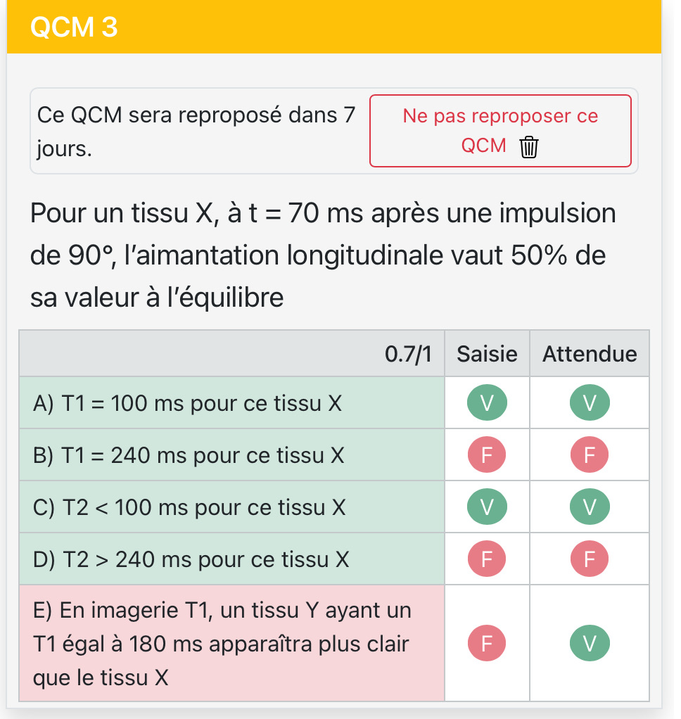 Tuteur Solution jadipocytes Posted November 3 Tuteur Solution Posted November 3 Salut ! Pour ça il faudra demander a ta prépa, ils sauront mieux te répondre car c'est leur qcm et que ca arrive qu'il y ait des erratas dans leur propre qcm (ce qui me semble le cas ici car ce sont les mêmes énoncés et questions pour des réponses différentes). Je peux quand même y répondre si ca t'aide sur quel qcm est vrai et quel qcm est faux : Le tissu X a un T1 de 100ms Le tissu Y a un T1 de 180ms On sait que Les tissus à T1 court retrouvent plus vite leur aimantation longitudinale et donc ont un signal plus clair. Ainsi T1 X < T1 Y donc X apparaitra plus clair. Lolordose and milpoulouc 1 1 Quote