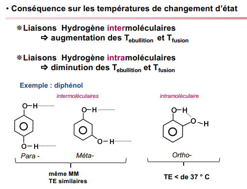 Tuteur Solution caro.tide Posted November 3 Tuteur Solution Posted November 3 Salut ! Je te renvoie à cette publication qui l'explique très bien ! On 12/1/2024 at 2:29 PM, Doc_Paillette said: Coucou @charlottetls, Les interactions inter et intra sont des liaisons hydrogène donc une liaison intermoléculaire plus forte que les autres, qui se rencontre si, et seulement si, un hydrogène fait un « pont » entre 2 des 3 atomes suivants : F, N, O. Pour une interaction intra, c'est au sien de la même molécule. Pour une interaction inter, c'est entre 2 molécules. Pour reconnaitre les interactions, il faut repérer les doublets non liant, donneur d'électrons des atomes F,N,O et les liaisons entre un hydrogène et un atome F,N,O. Lorsque tu as un phényl, tu ne peux avoir une liaison H intra seulement en ortho sinon les atomes sont trop éloignés. Je te mets cette diapositive du cours qui explique les effets sur la température. Enfin en qcm, lorsqu'on te parle de température de changement d'état, et qu'on te demande le type d'interaction, il faut se fier à cette diapositive ! J'espère avoir répondu à ta question ;) N'hésite pas si ce n'est pas clair ou si tu as d'autres questions ! et bon courage pour l'EB demain !! Ankyyrine, Bastitine and Enroutesimone 2 1 Quote