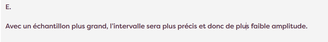 Loulou1777 Posted November 4 Posted November 4 Coucou, selon moi, plus on a de données, plus on est sûre de notre résultat, par exemple si tu veux estimer la taille moyenne des hommes français tu peux pas faire qu’une moyenne entre ton père, ton tonton et ton frère parce que ce serait pas représentatif de la population entière, alors que si tu prends un maxxx de valeurs t’es beaucoup plus proche de la réalité, —> plus précis —> donc l’intervalle de confiance sera moins large. J’espère que c’est assez clair ethanastomose, emeline01, OnNeGiflePasLeVent and 2 others 5 Quote